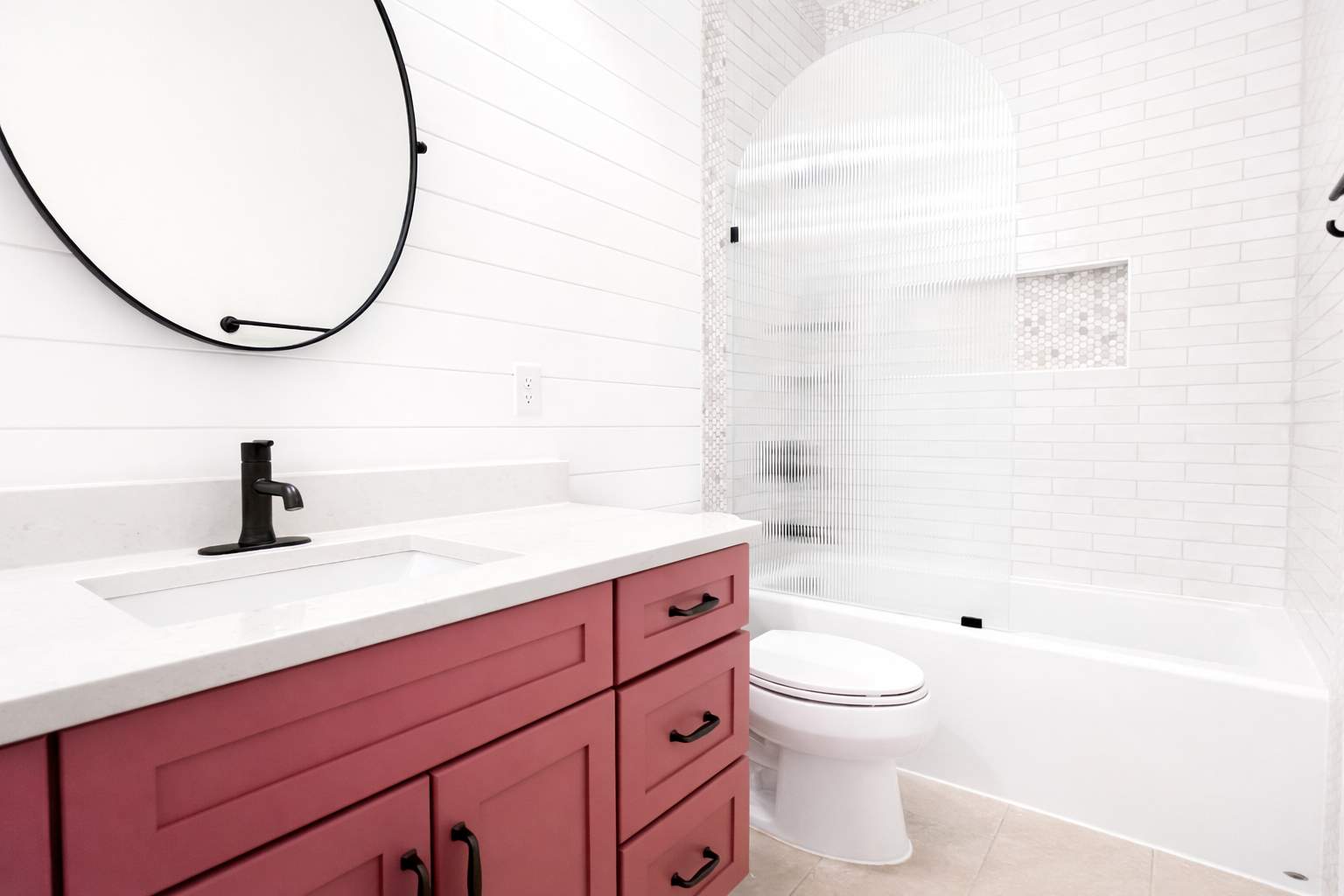 This Stone Oak hall bathroom remodel in San Antonio transformed a dated builder-grade space into a bright, personality-filled bathroom with custom details and a fresh modern feel. The updated design pairs crisp white tile with clean-lined shiplap walls, creating a light and airy backdrop that lets the standout pink vanity bring warmth and charm to the room. In the tub and shower area, white subway tile surrounds the space while a recessed niche with hex mosaic tile adds both texture and function. One of the most eye-catching features is the curved fixed shower glass, which softens the room’s lines and gives the tub-shower combination a distinctive designer look. Matte black plumbing fixtures and hardware provide contrast throughout the bathroom and tie the finishes together. The new vanity adds a fun, unexpected pop of color while still feeling polished and timeless. Paired with a sleek countertop, round mirror, and updated lighting, the finished space feels elevated, cheerful, and highly functional for everyday use. This San Antonio bathroom remodel is a great example of how thoughtful selections can completely change the character of a hall bathroom without sacrificing practicality.