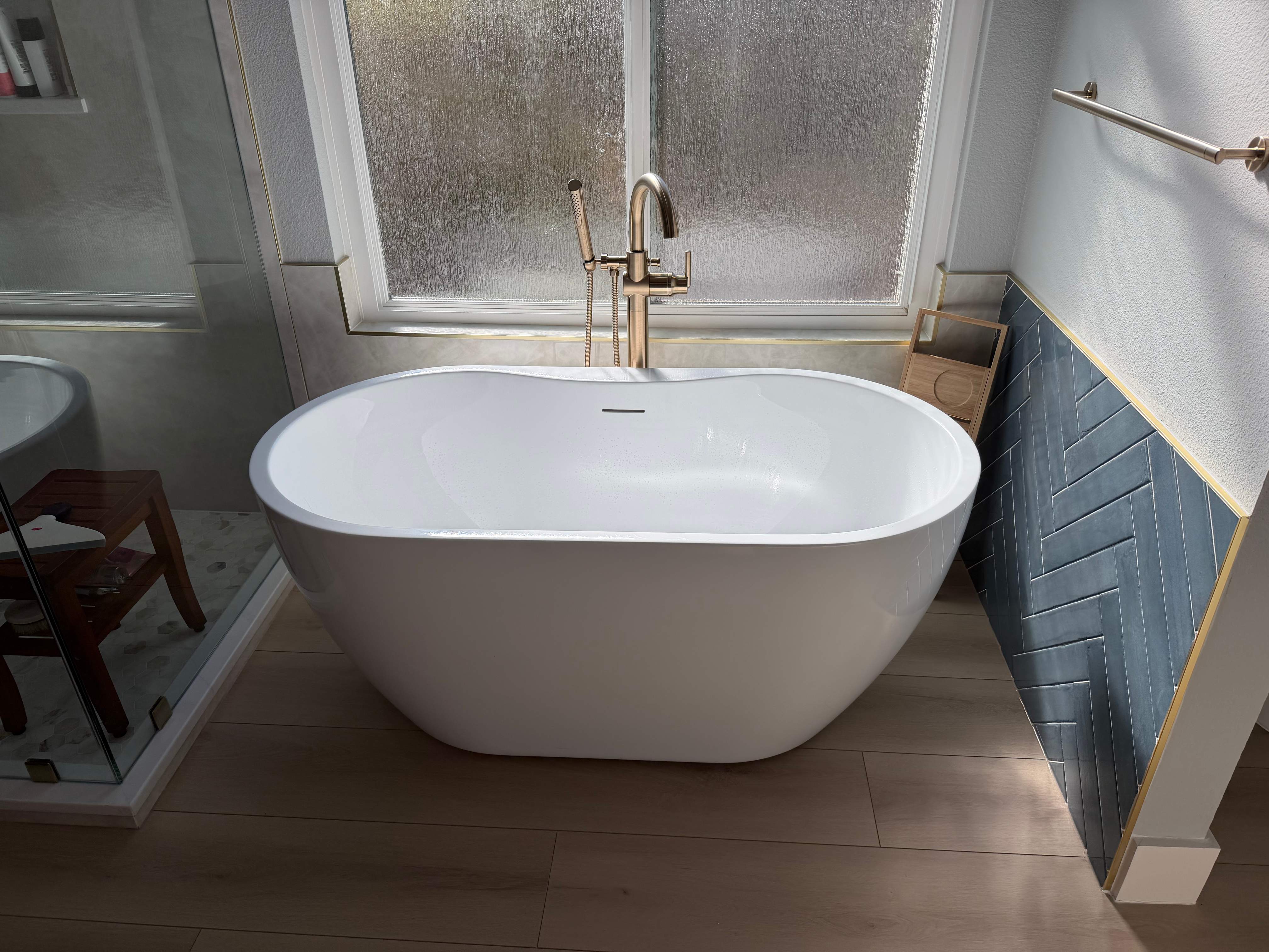 This Stone Oak primary bathroom felt dated and visually heavy, with dark tile and bulky shower framing. The homeowners wanted a brighter, more relaxing space that felt intentional and spa-inspired. By replacing the enclosed shower with frameless glass and introducing a blue herringbone feature wall, the shower instantly became a statement element without overwhelming the room. Brushed gold fixtures add warmth and elevate the overall design. The corner soaking tub was replaced with a freestanding tub beneath the window, creating a true focal point and improving the flow of the space. Warm wood cabinetry, quartz countertops, and updated lighting complete the transformation, resulting in a bathroom that feels both modern and inviting.