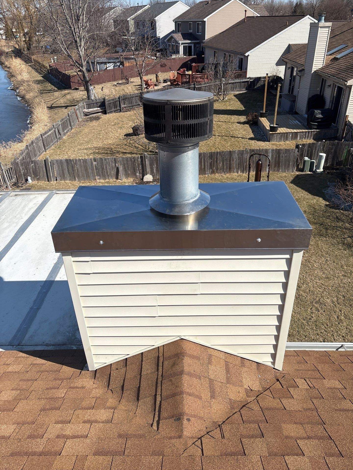 In this project the warped and deteriorated sheet metal chase cover and trim board was replaced with a new custom fabricated stainless steel chase cover and new wooden trim. Did you know stainless steel is recommended over regular sheet metal for chimney chase covers, because it is significantly more durable and resistant to corrosion? Unlike galvanized or painted sheet metal, stainless steel will not rust or deteriorate over time when exposed to rain, snow, or chimney gases. This ensures a longer lasting solution that protects the chimney structure from water damage and leaks. Though stainless steel may cost more initially, its superior lifespan and performance make it a more cost-effective and reliable choice in the long run.