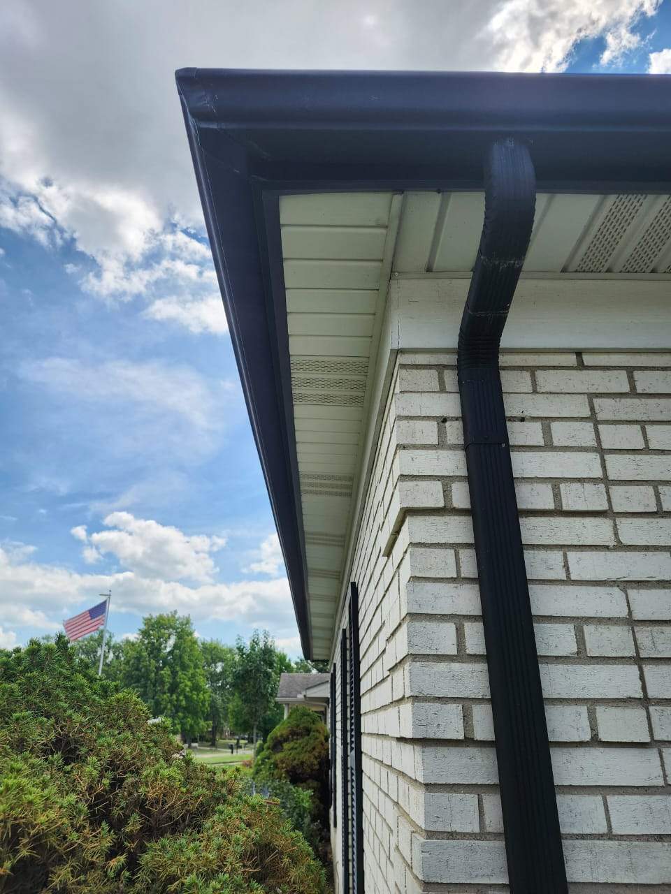 This project was a great example of why you have to look closer at the details. The real problem here wasn't just the old gutters—it was the drip edge. It wasn’t long enough to reach the gutters, so water was literally running behind them and soaking the house. We went ahead and replaced the drip edge around the entire house. To really make it stand out, we matched the flashing to the new black gutters. Now, the water actually goes where it's supposed to, and that black trim against the white brick looks incredible—it really pops.