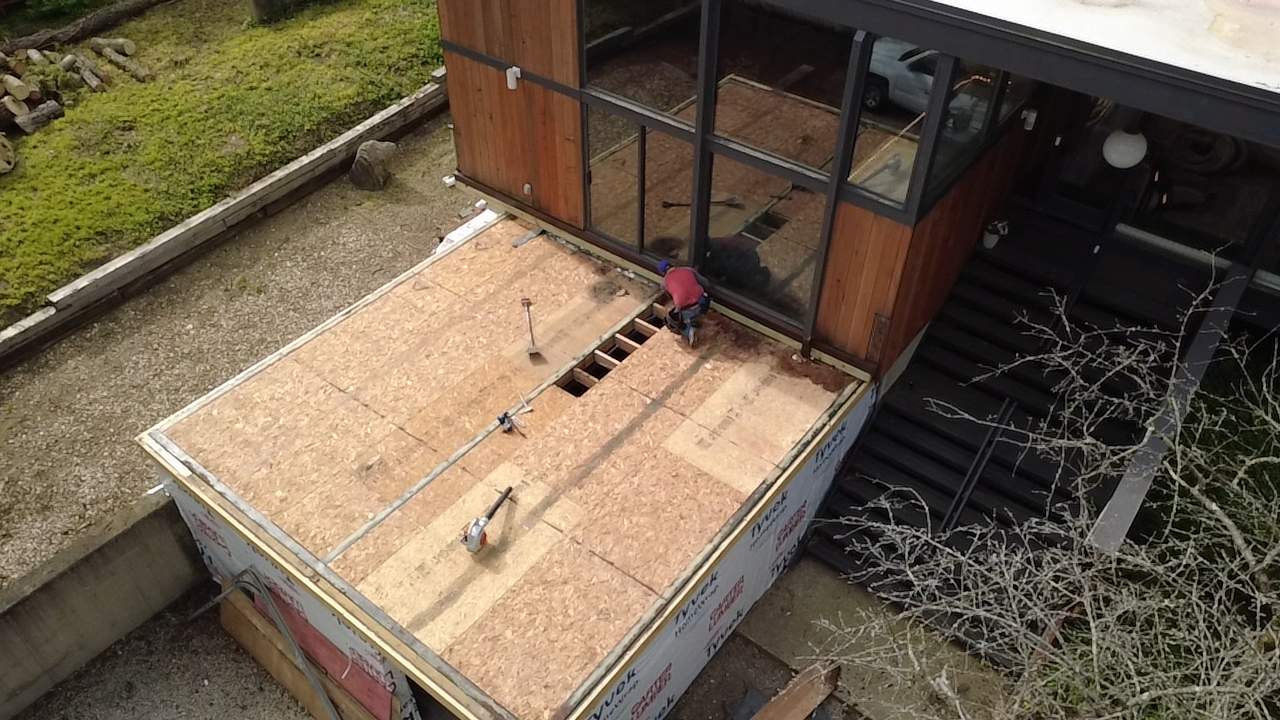This project is a perfect example of why we believe in tearing flat roofs right down to the deck. You can't just cover over old problems. On this residential job, once we ripped up the old roofing material, the wood deck underneath told the real story. You can see staining and signs of wear, especially near the windows and walls where leaks usually start. Instead of ignoring it, we got to work repairing the structure. One of the photos shows our crew actively cutting out a bad section of the decking so we could replace it with fresh wood. We also installed new perimeter blocking over new Tyvek wrap to make sure the edges were solid. It’s ugly work right now, but getting this foundation perfect is the only way to guarantee the new roof will last.