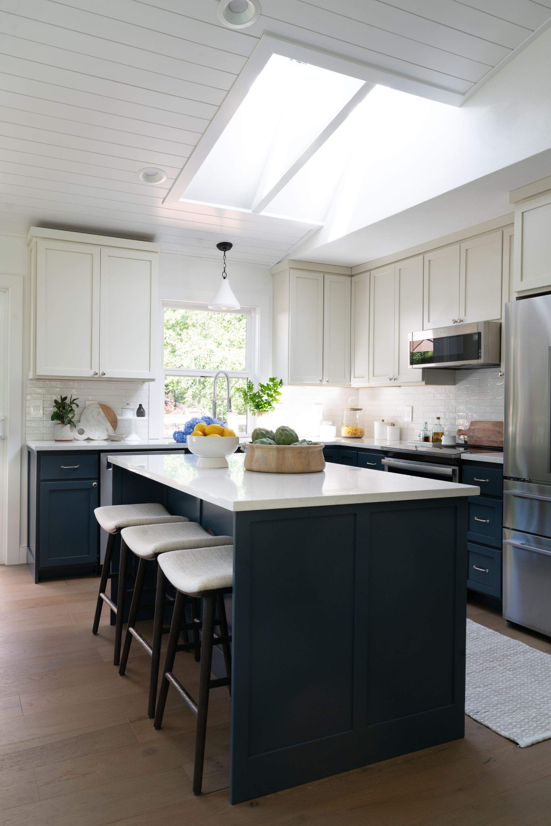 This project entailed a whole home remodel in partnership with Fobes Hill Studio (www.fobeshillstudio.com) with the goal of transitioning from a dated house, to a multigenerational home. We removed a main wall that separated the kitchen from the living room, completely transforming the space to a light filled oasis. A bedroom was converted to a TV room that could double as a guest bedroom when the need arises. The laundry room space and adjoining hallway was joined to create a larger laundry room that allowed for a more spacious working area. Finishes included a beautiful shiplap vaulted ceiling, timeless tile work, brand new oak floors throughout, and a custom table crafted at our in-house wood shop. To further improve the comfort of the home, a new ducted min-split heating and AC system was installed to replace outdated wall heaters. New windows were added, and the home was completed re-sided, including new house-wrap and air sealing. Design by www.fobeshillstudio.com