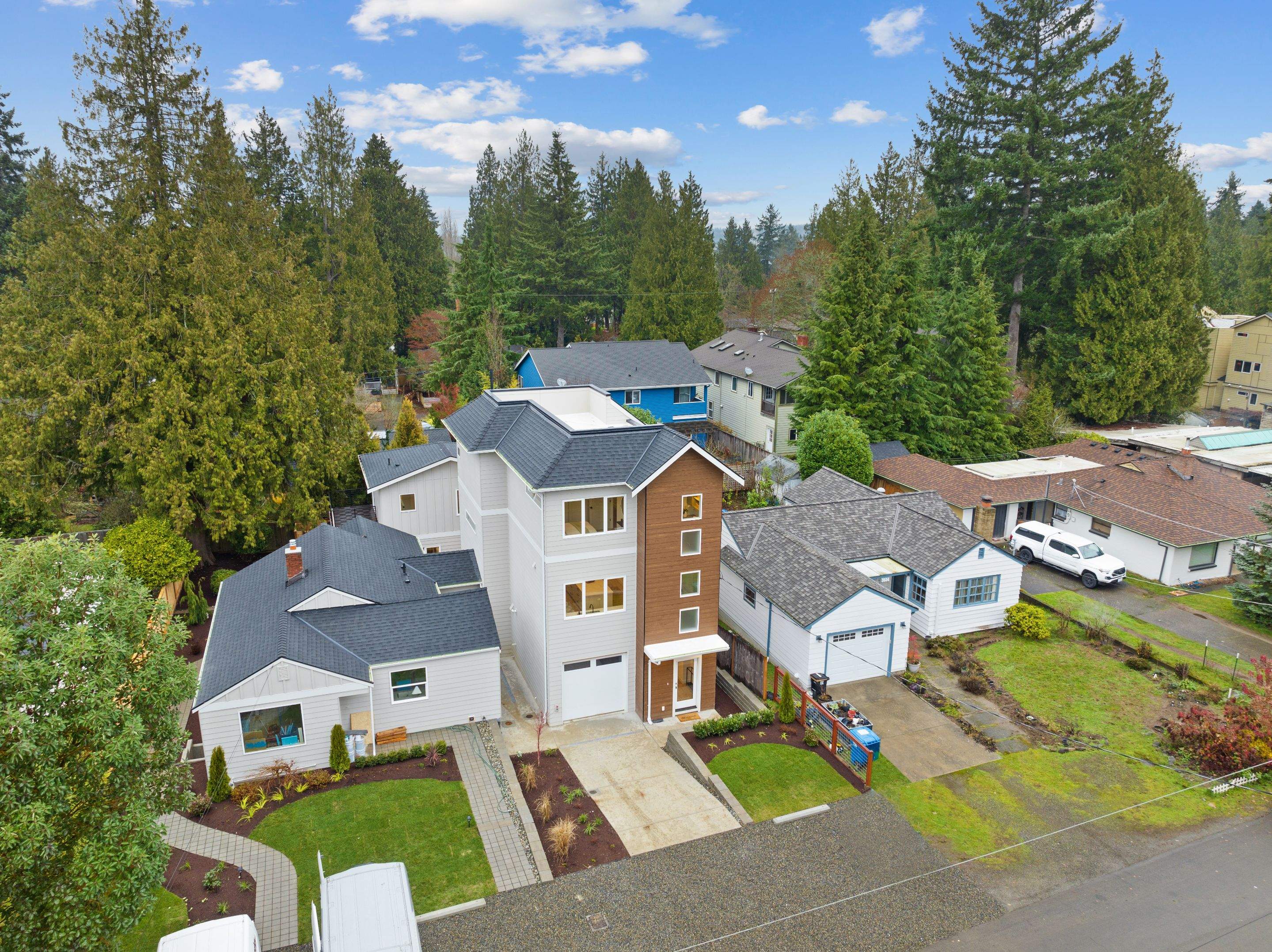 Our NE 87th St project at 3818 NE 87th St in Seattle highlights our ability to blend innovative new construction with the preservation and transformation of an existing home. This three‑home development included a full renovation and conversion of the original house into a spacious 3‑bed, 3‑bath AADU, along with the ground‑up construction of a new single‑family residence and a detached ADU. One of the site’s defining features was a large, mature cedar tree that had to be protected throughout construction—requiring careful planning, specialized equipment access, and precise coordination. Additional site challenges included complex drainage conditions that demanded creative waterproofing solutions and engineered systems to ensure long‑term performance. The newly built SFR and DADU both feature fenced yards, EV‑ready parking, and efficient layouts designed for modern living. The remodeled AADU retains the character of the original home while offering upgraded systems, refreshed finishes, and a flexible lower-level mother‑in‑law–style space with its own bedroom, bathroom, living area, and separate entry for multi-generational living. This project demonstrates our expertise in adaptive reuse, site-sensitive construction, and delivering high‑quality residential homes that balance modern design with the natural beauty of the site.