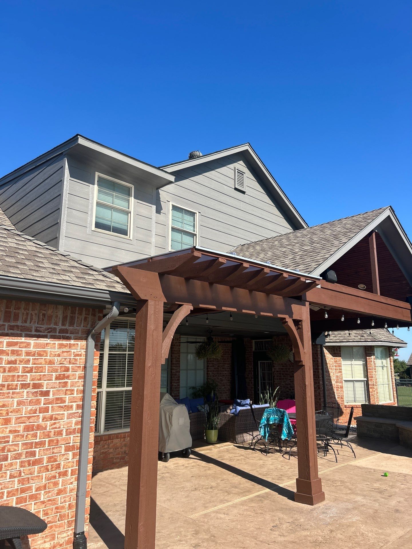 This Edmond homeowner completed a full exterior transformation that included new siding, a complete exterior paint job, and the installation of a pergola cover. We removed the old siding, installed new siding for improved protection, professionally painted the exterior provides a fresh look, and installed a pergola cover to create a comfortable, usable outdoor living space.