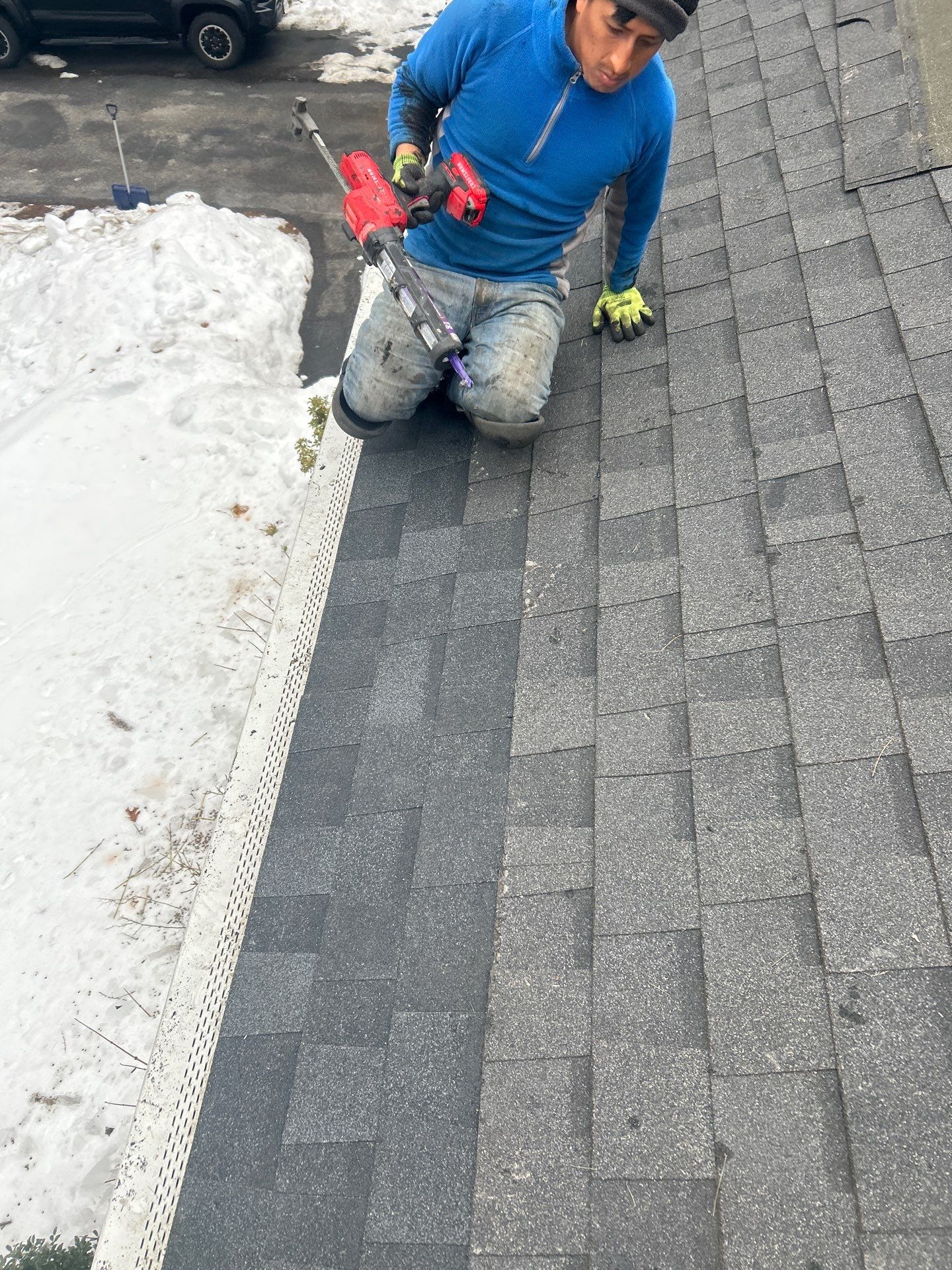 This homeowner in Billerica, MA contacted Mighty Dog Roofing after significant ice dam buildup and snow accumulation created an urgent threat of interior water intrusion. Massachusetts winters consistently produce the freeze-thaw cycles that drive ice dam formation — particularly on homes where heat loss through the attic allows snow to melt, refreeze at the cold eave edge, and back up beneath the shingle line. Unlike contractors who work exclusively from the ground or roofline, our crew physically accesses the roof using full harness and safety systems, allowing for more precise, controlled, and effective ice dam removal. This distinction matters — working only from the roofline limits the crew's ability to properly address the full eave zone and safely manage accumulated snow loads across the entire roof surface. Our scope for this project covered full snow removal, carefully clearing accumulated snow from the eaves upward to reduce excess roof load and prevent additional ice dam formation. Ice dam mitigation was then performed along the roof eaves, breaking up and removing existing buildup to relieve water backup pressure and reduce the risk of damage reaching interior living spaces. All snow and ice debris was directed away from walkways, entry areas, and landscaping throughout the process. Work was completed without salt, chemicals, or aggressive mechanical tools on the roofing surface, following strict winter safety protocols throughout. Homeowners with gutter systems featuring filters or guards are always informed upfront that mechanical removal processes can occasionally affect those components — transparency is part of every job we take on. Our primary focus remains the critical 6-foot eave zone — the area most vulnerable to ice dam damage and the section typically covered by a home's existing ice and water shield membrane. This service does not include permanent roof repairs, ventilation modifications, or interior water damage remediation unless separately contracted. If you're a homeowner in Billerica or the north of Boston area dealing with ice dams or dangerous winter snow loads, contact us today for fast, professional, and safety-first service.