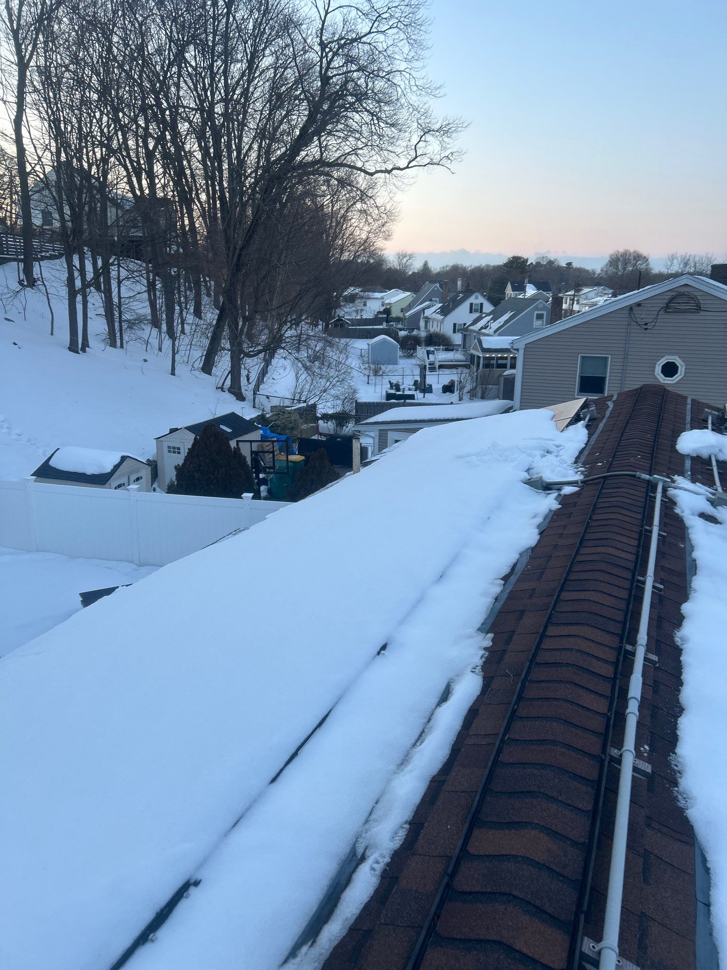 This homeowner in Woburn, MA contacted Mighty Dog Roofing during a critical winter weather situation requiring immediate ice dam mitigation and snow removal. Heavy snow accumulation and freezing temperatures had created significant ice dam buildup along the roof eaves, putting the home at serious risk of interior water intrusion and structural damage. Unlike many contractors who work exclusively from the roofline, our crew physically accesses the roof using proper harness systems and safety equipment, allowing us to address ice dam buildup with greater precision and effectiveness — not just from the ground up. Our scope of work included full snow removal, carefully clearing accumulated snow from the eaves upward to reduce excess roof load and prevent further ice dam formation. We then performed targeted ice dam mitigation along the roof eaves, breaking up and removing existing ice buildup to relieve water backup pressure and reduce the risk of interior damage. All snow and ice debris was safely directed away from walkways, entry areas, and landscaping throughout the process. Work was performed following strict winter safety protocols, without the use of salt, chemicals, or aggressive mechanical tools on the roofing surface. Our primary focus remains on the critical 6-foot eave zone — the area most vulnerable to ice dam damage and typically protected by the home's existing ice and water shield membrane. Homeowners are informed upfront that gutter systems with filters or guards may be affected by mechanical removal processes, and that in rare cases minor shingle brittleness under extreme cold can result in incidental surface contact — any such findings are communicated immediately and repair options are discussed transparently before any additional work proceeds. This service does not include permanent roof repairs, insulation upgrades, ventilation modifications, or interior water damage remediation unless separately contracted. If you're a homeowner in Woburn or the north of Boston area dealing with ice dams this winter, contact us today for fast, safe, and professional emergency service.