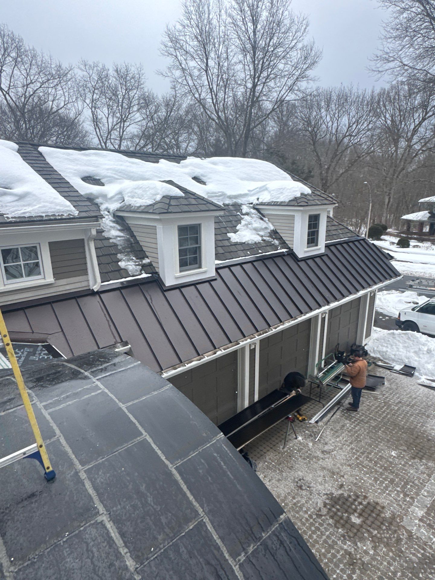 Complete Roof Replacement in Lexington, MA – Premium Upgrade with CertainTeed Grand Manor & Standing Seam Metal This homeowner in Lexington, MA contacted Mighty Dog Roofing after their aging roofing system required a full replacement. Years of exposure to Massachusetts winters, ice dam activity, and seasonal wind stress had taken a toll on the existing structure, making a comprehensive upgrade the right long-term solution. We completed a full roof replacement using CertainTeed Grand Manor 5-layer laminated shingles, one of the most architecturally refined and durable options available in the residential roofing market. The system was installed with a bronze colored W-valley metal system, 606 LF of bronze drip edge, and step flashing throughout, ensuring proper drainage performance and a clean, finished appearance across all roof planes. To protect against Massachusetts ice dam formation and heavy precipitation, we installed Grace Ice & Water Shield HT along all vulnerable zones, paired with CertainTeed DiamondDeck underlayment for full-surface protection. At the rear chimney valley — one of the most water-critical areas on any roof — we applied a EPDM Mule-Hide 60 mil membrane for maximum waterproofing integrity where standing water exposure is highest. This project also included a VELUX fixed deck-mount skylight replacement with a solar-powered shade, enhancing natural light while eliminating a common leak point. The front porch received a full standing seam metal roofing installation using ATAS International Dark Bronze 24-gauge panels with Kynar PVDF finish and a concealed fastener system — built to last decades with minimal maintenance. Cedar clapboard siding was carefully removed and reinstalled at all transition walls to ensure seamless integration between roofing and wall systems. The entire system is backed by the CertainTeed SureStart PLUS 4-Star Warranty, including 50-year non-prorated material and labor coverage, a 25-year workmanship warranty backed directly by CertainTeed, 130 mph wind resistance, and 15-year StreakFighter algae protection. If you're a homeowner in Lexington or the west of Boston area looking for a long-term roofing solution, schedule your free inspection today.