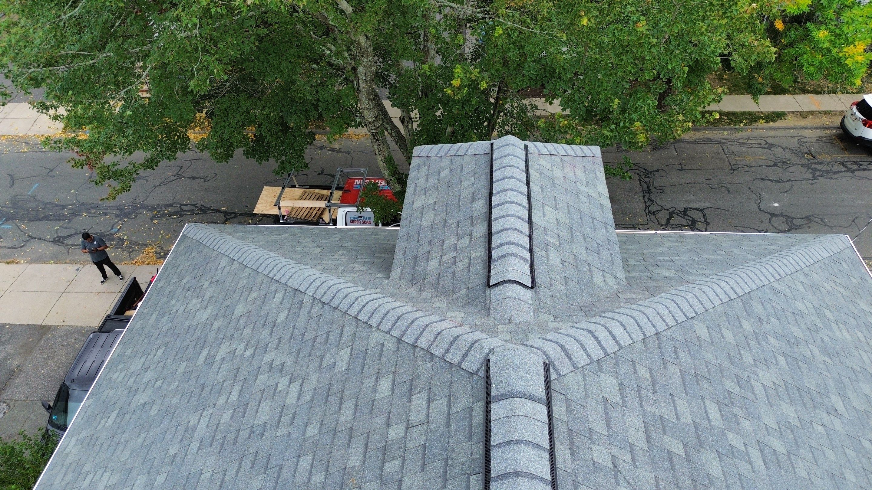 At this Belmont property, our team is completing a full roofing system replacement paired with new seamless aluminum gutters. The work begins with the careful removal of the old shingles, followed by re-nailing and preparing the decking. We are installing Rhino ice and water barrier, Mighty Dog U20 synthetic underlayment, and Owens Corning OakRidge shingles in Estate Gray for a durable and attractive finish. The system is reinforced with aluminum drip edge, new step flashing, lead counter flashing at the chimney, and Owens Corning ridge vent with ProEdge hip and ridge caps to ensure optimal ventilation. The gutter portion of the project involves removing select existing gutters and downspouts, replacing damaged sections, and installing all-new 5" K-style seamless aluminum gutters and 2x3” downspouts in white. Gutters are pitched properly, installed with rigid bar hangers, and sealed to guarantee long-term performance. This combination of roof and gutter replacement provides a complete upgrade to the home’s exterior, ensuring both protection and enhanced curb appeal.
