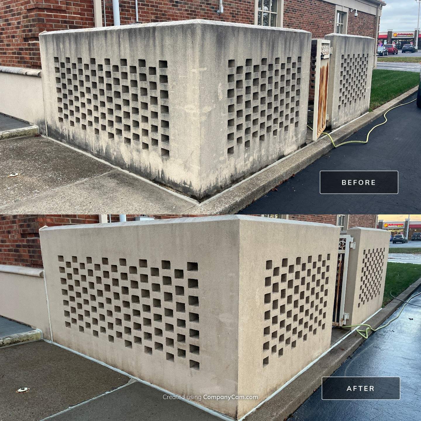 An after hours cleaning of this bank. The fragile stucco surface was effectively cleaned at a low 200psi after chemical treatment.