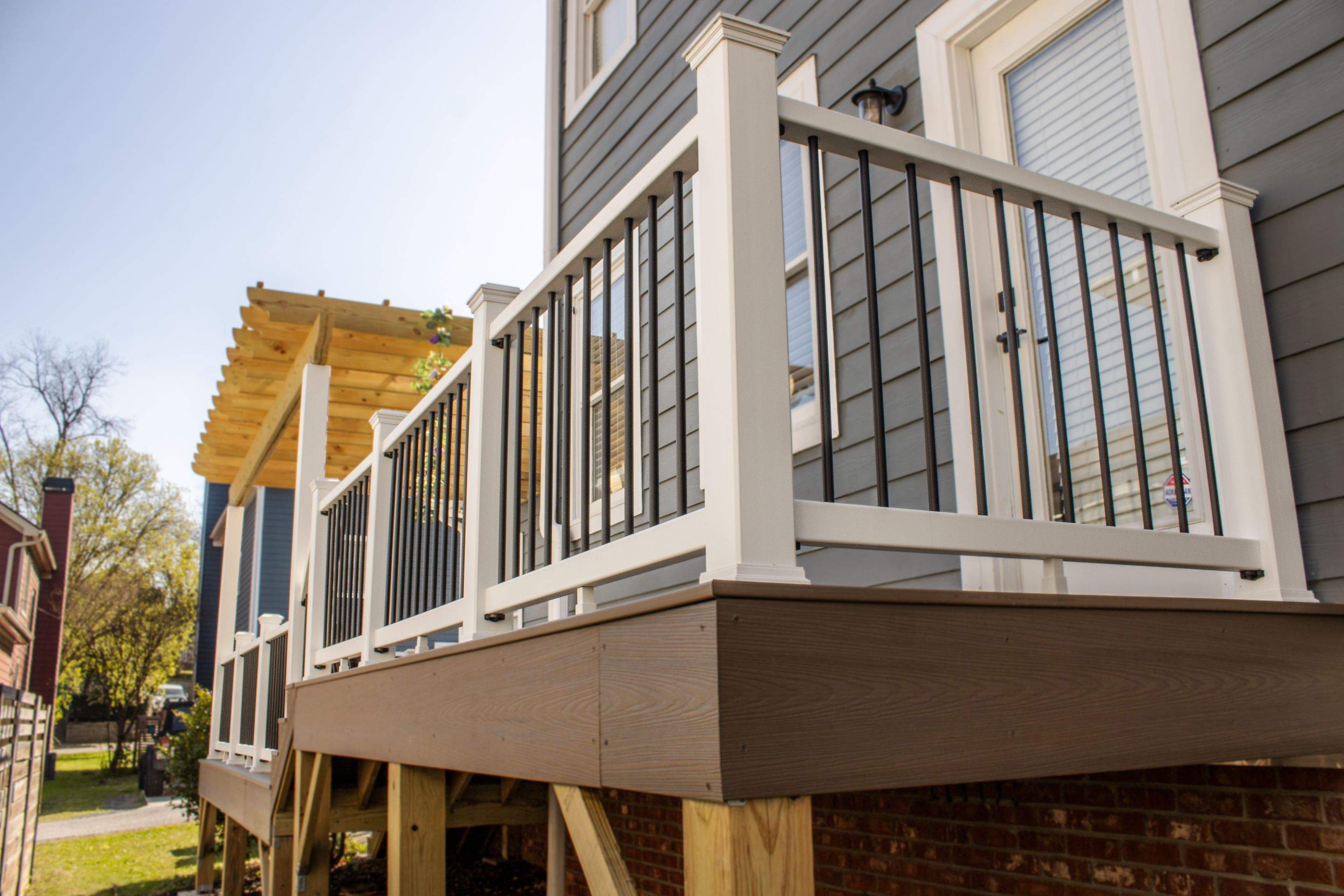 This Atlanta, GA deck rebuild project included building a new deck using Deckorators Venture Series decking products, and installing Trex Classic White Composite Railing. We installed black round aluminum balusters, and built a pressure treated pine pergola on top of the deck.