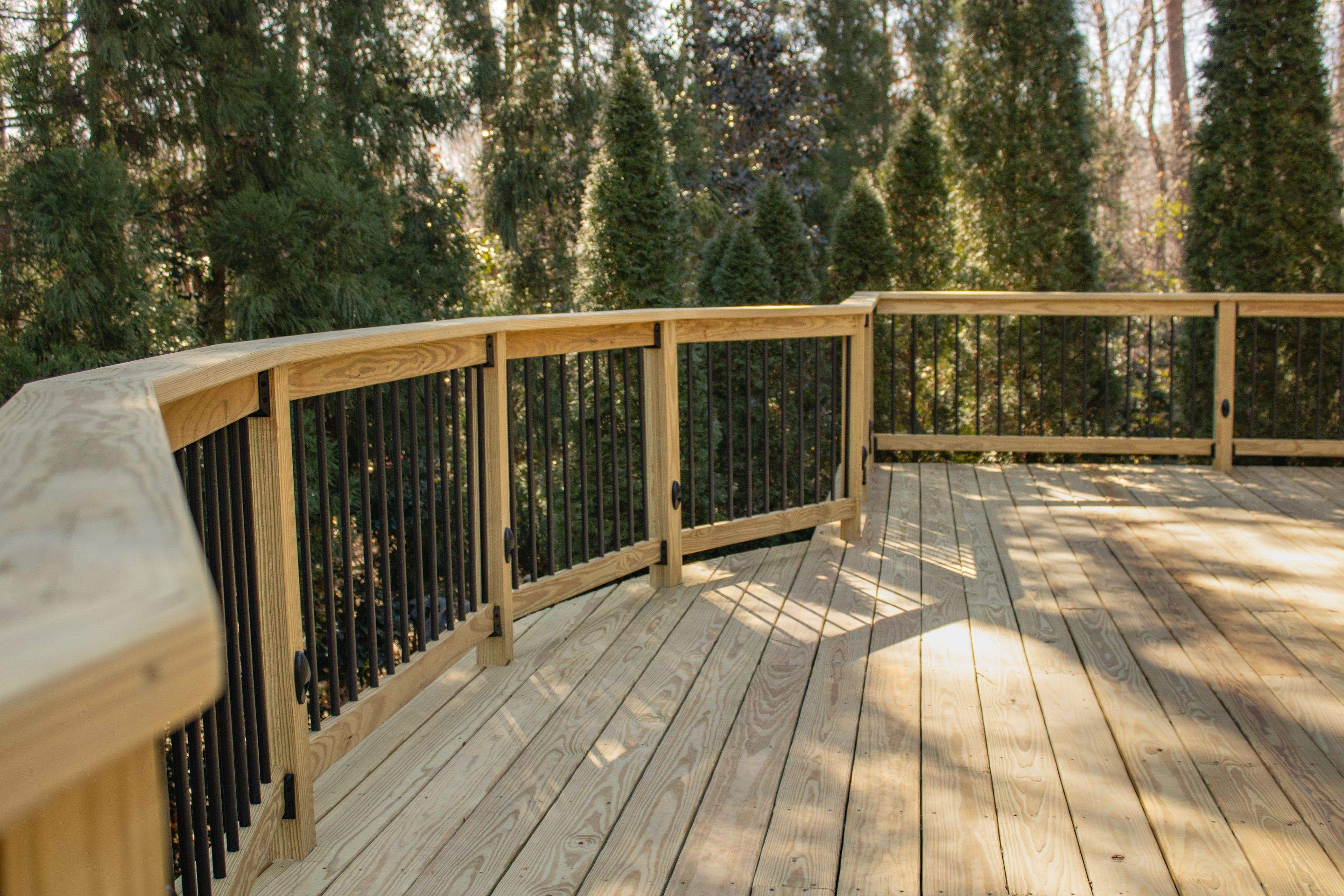 For this Kennesaw, GA project, we completed a wood deck resurfacing with pressure treated pine. This included wood railing with KDAT PT cross rails, KDAT top cap, and black aluminum round balusters. We then added a special feature: Timbertech Deck Lighting with Timbertech LED Accent lights. Along with this, we wrapped the columns and painted the deck band board.