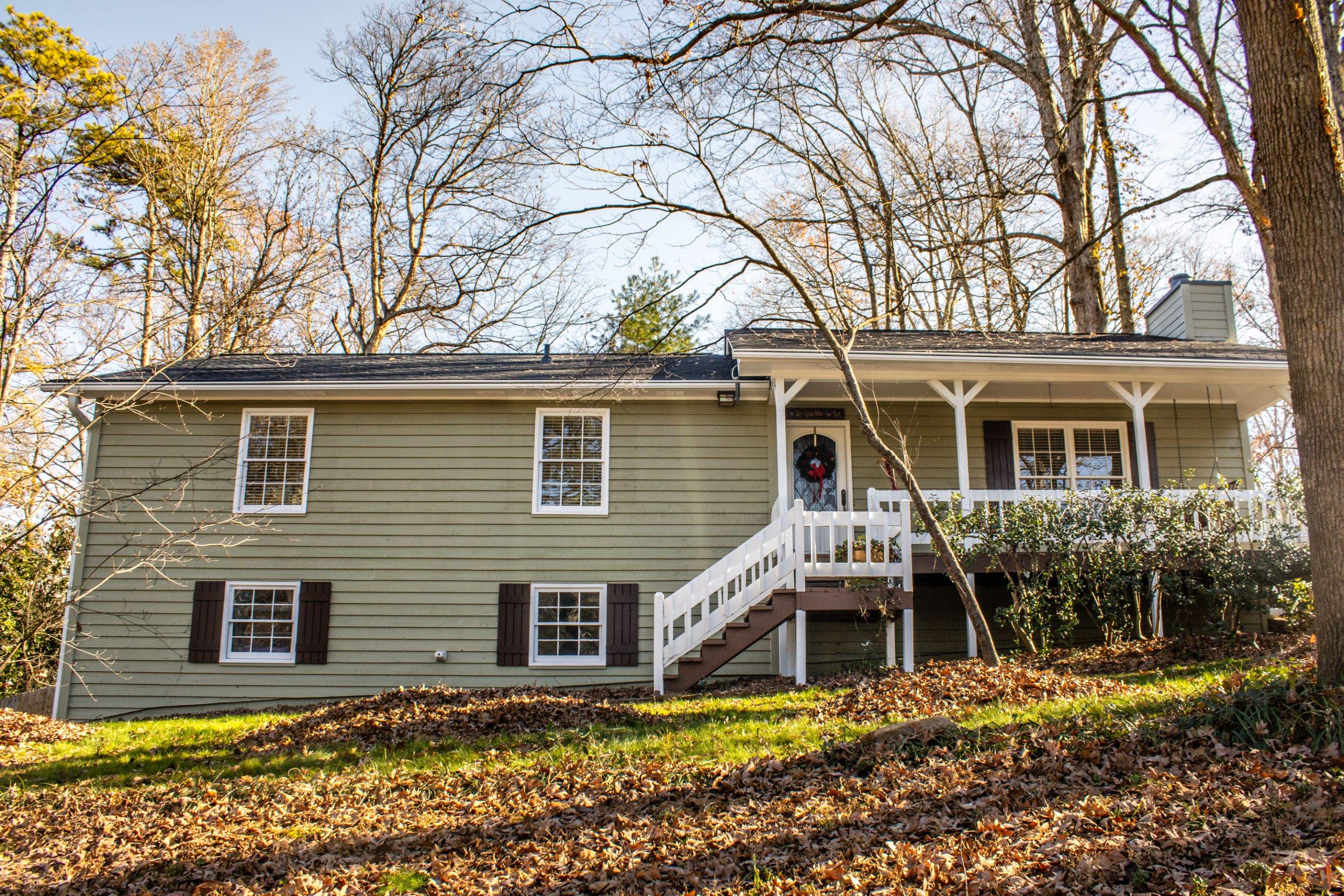 On this Marietta, GA home, we replaced areas of rotted wood on the soffit, fascia, corner boards, windowsills, and door jamb. We also replaced a few deck boards on the back deck, and some pieces of siding around the home where needed. Lastly, we used Sherwin-Williams SuperPaint to paint the exterior, WoodScapes for the cedar siding stain, and SuperDeck to stain the deck.
