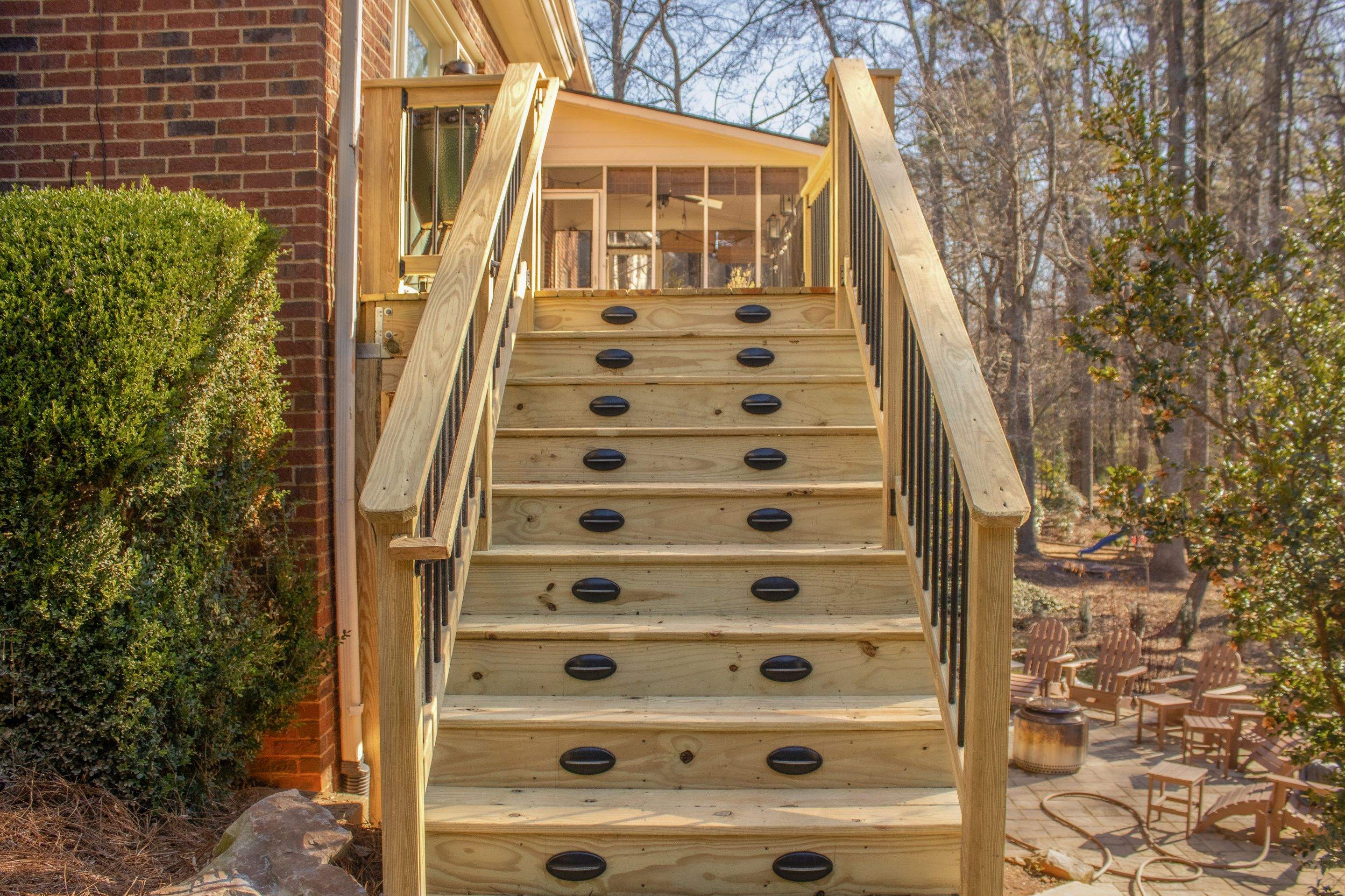 On this Marietta, GA home, we removed the old deck, and installed a new deck with concrete footers, Galvanized stand-off post brackets, and support posts. The deck itself was built using pressure treated pine, and we used a KDAT top cap with black aluminum round balusters underneath. Lastly, we installed a beautiful feature: Timbertech Deck Lighting with LED riser and accent lights.