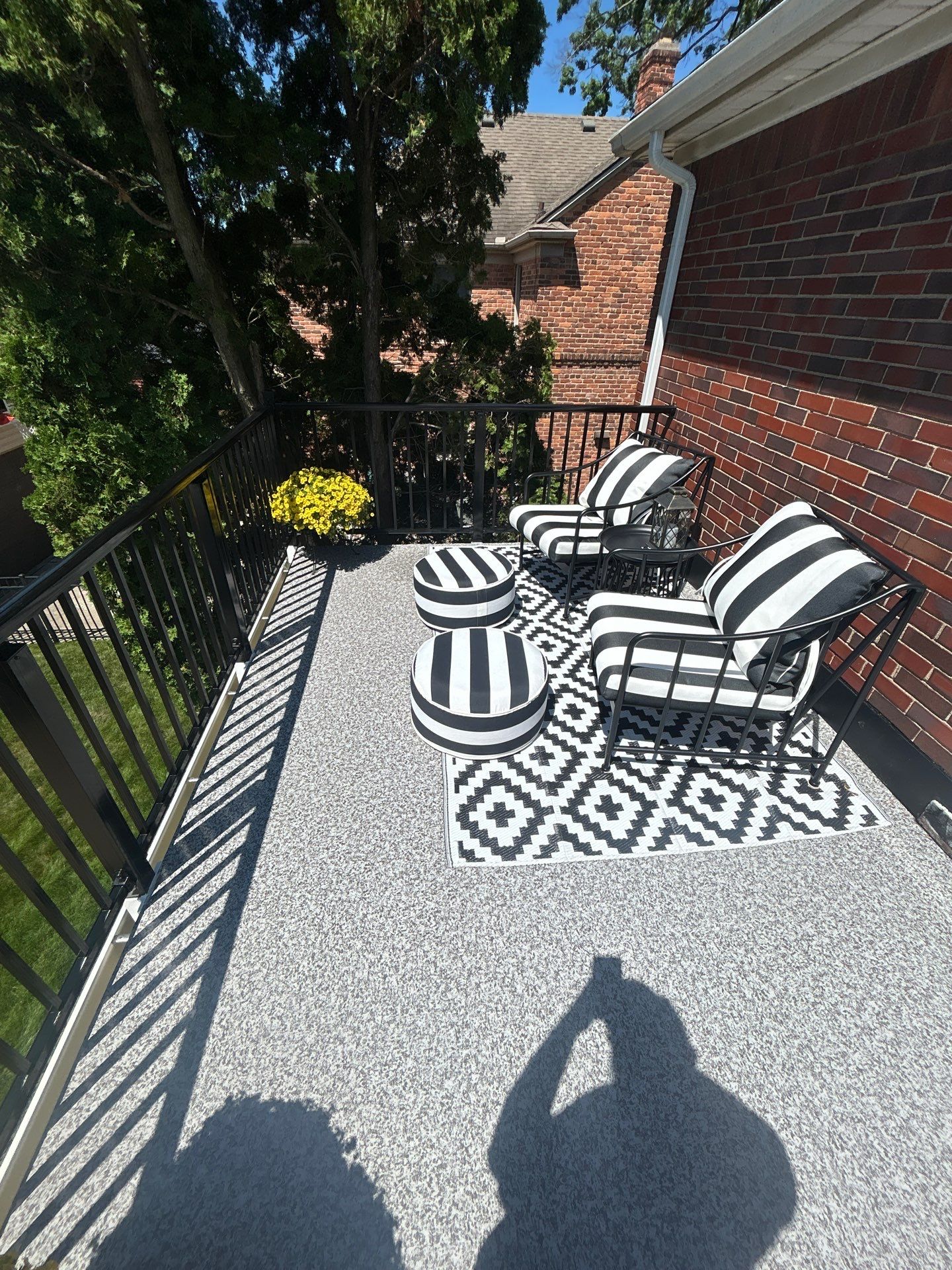 Balcony stripped down to the deck, new subfloor, dectec roofing membrane, and aluminum surface mounted railing.