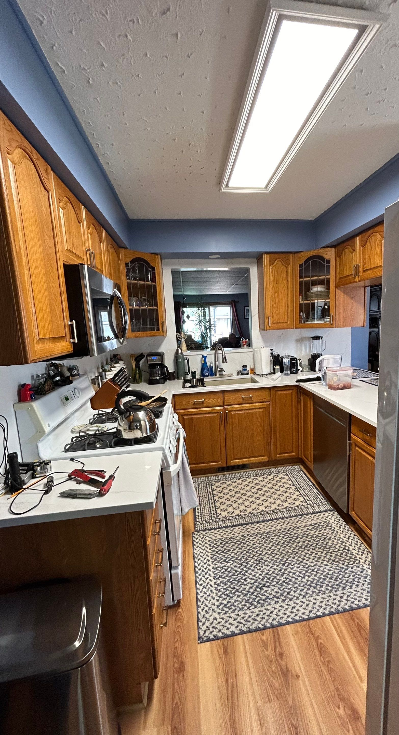 Kitchen facelift; new flooring, counter tops, painting, lighting, sink, and a new pantry cabinet.