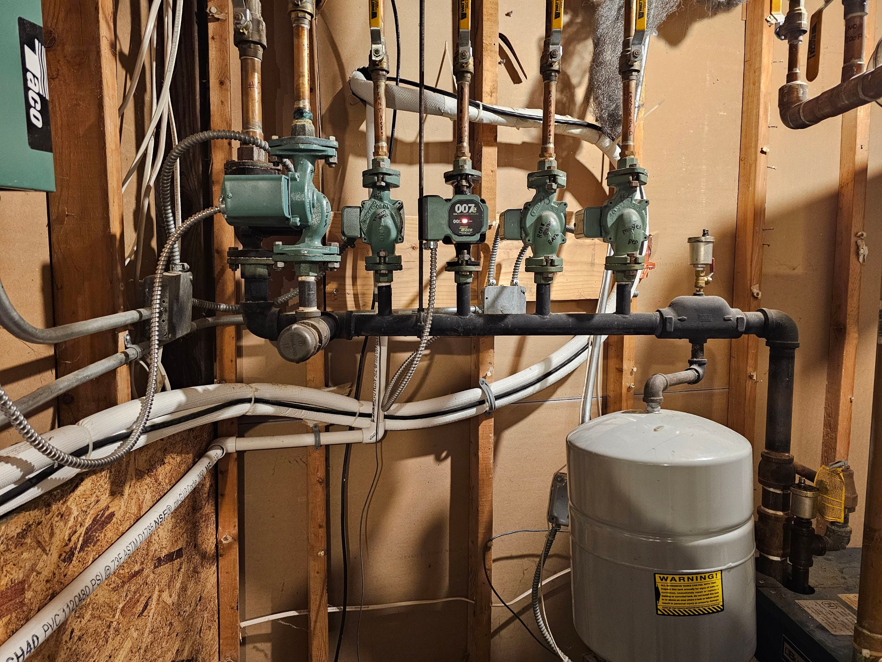 We recently completed a comprehensive installation of a new boiler and hydronic heating system for a homeowner in Portsmouth. This project involved the integration of multiple components, including circulator pumps, expansion tanks, and extensive copper and black iron piping, to create an efficient and reliable heating solution. The system features Taco circulator pumps, a Watts Regulator expansion tank, and a Beckett oil burner, all connected to a robust network of copper and iron piping. We also installed necessary safety devices such as low water cut-offs to ensure the system's longevity and safe operation, delivering a completely new, modern heating infrastructure.
