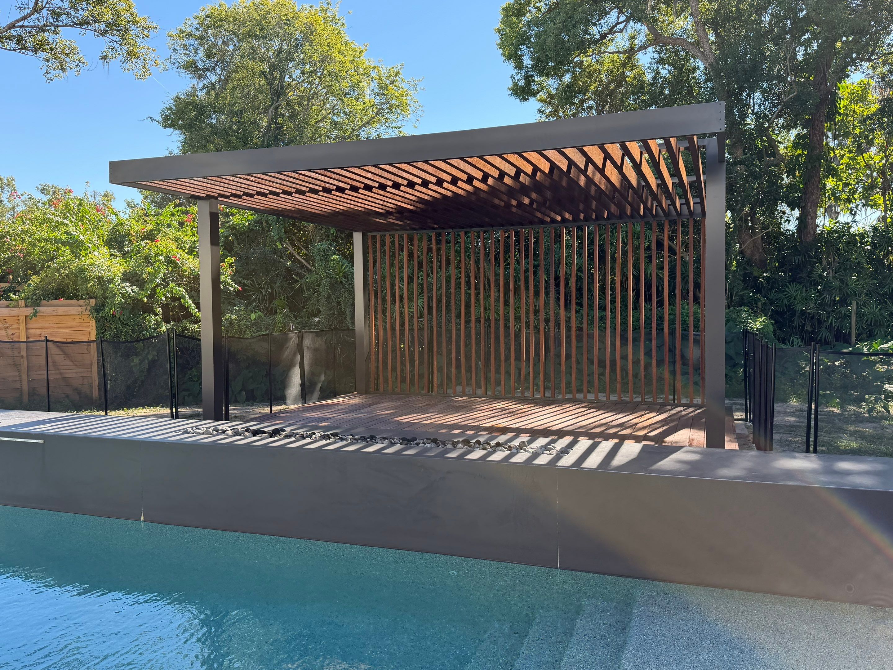 This project represents the pinnacle of modern outdoor design, creating a seamless fusion between industrial strength and natural beauty. The structural core is built with our signature Heavy-Duty Aluminum Framing in a dark finish, providing a stark, modern outline that requires zero maintenance. To soften the aesthetic, we integrated hand-selected Cypress Wood Rafters for the open-air roof, creating a stunning architectural trellis that filters sunlight and casts dynamic shadows throughout the day. The foundation of this oasis is a premium Ipe Wood Deck (Brazilian Walnut)—known as the hardest and most durable decking material in the world—expertly installed to float right up to the pool’s edge.