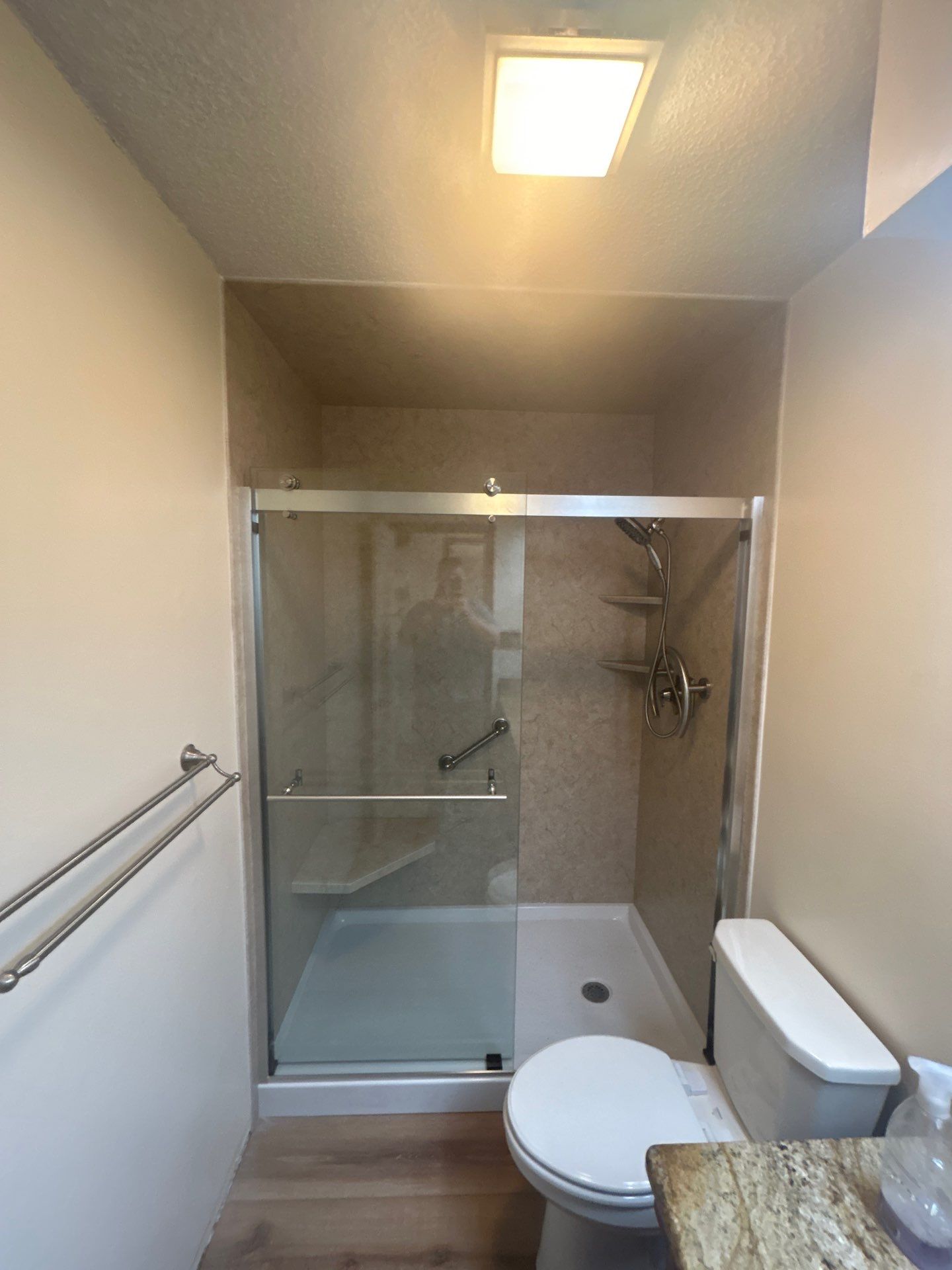 Soffit Removal, Corner Seat, Corner Shelf, Barn Door Slider, Tub to Shower Conversion