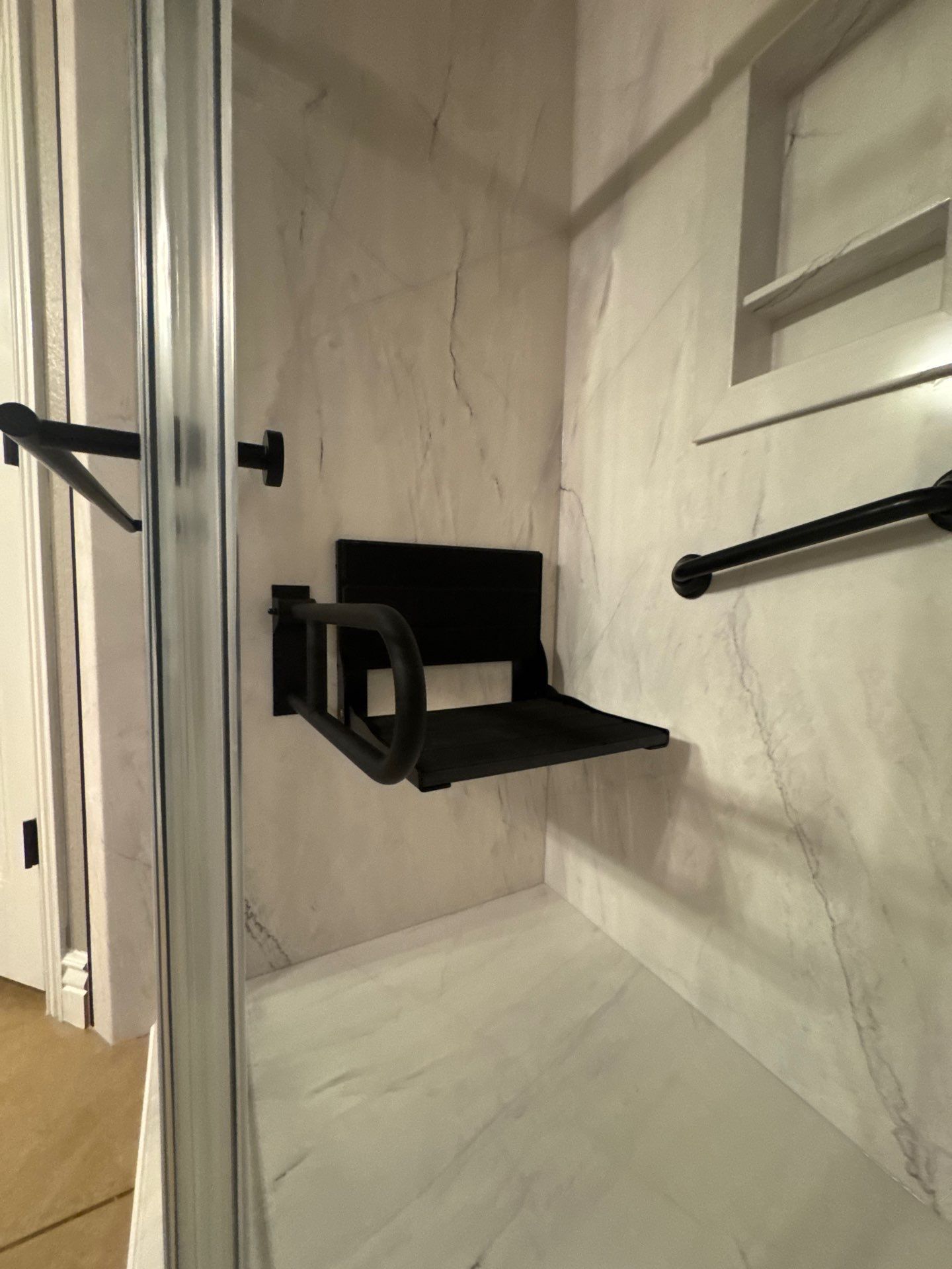 Azzura Bay Walls, Folding seat, Grab Bar, Moen Verso, Recessed Caddy, Tub to Shower Conversion