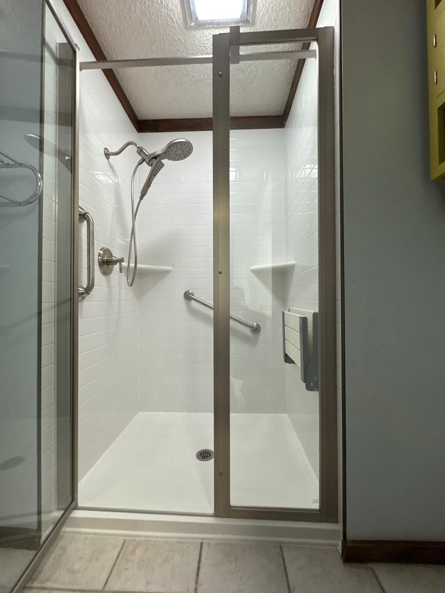 Simulated Subway Tile, Folding seat, Moen Verso, Elera Pivot Door, Grab Bar, Shower Replacement