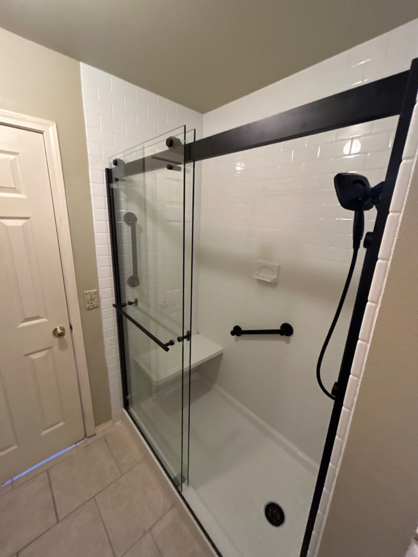 Simulated Subway Tile, Bench Seat, Barn Door Slider, Grab Bar, Tub to Shower Conversion