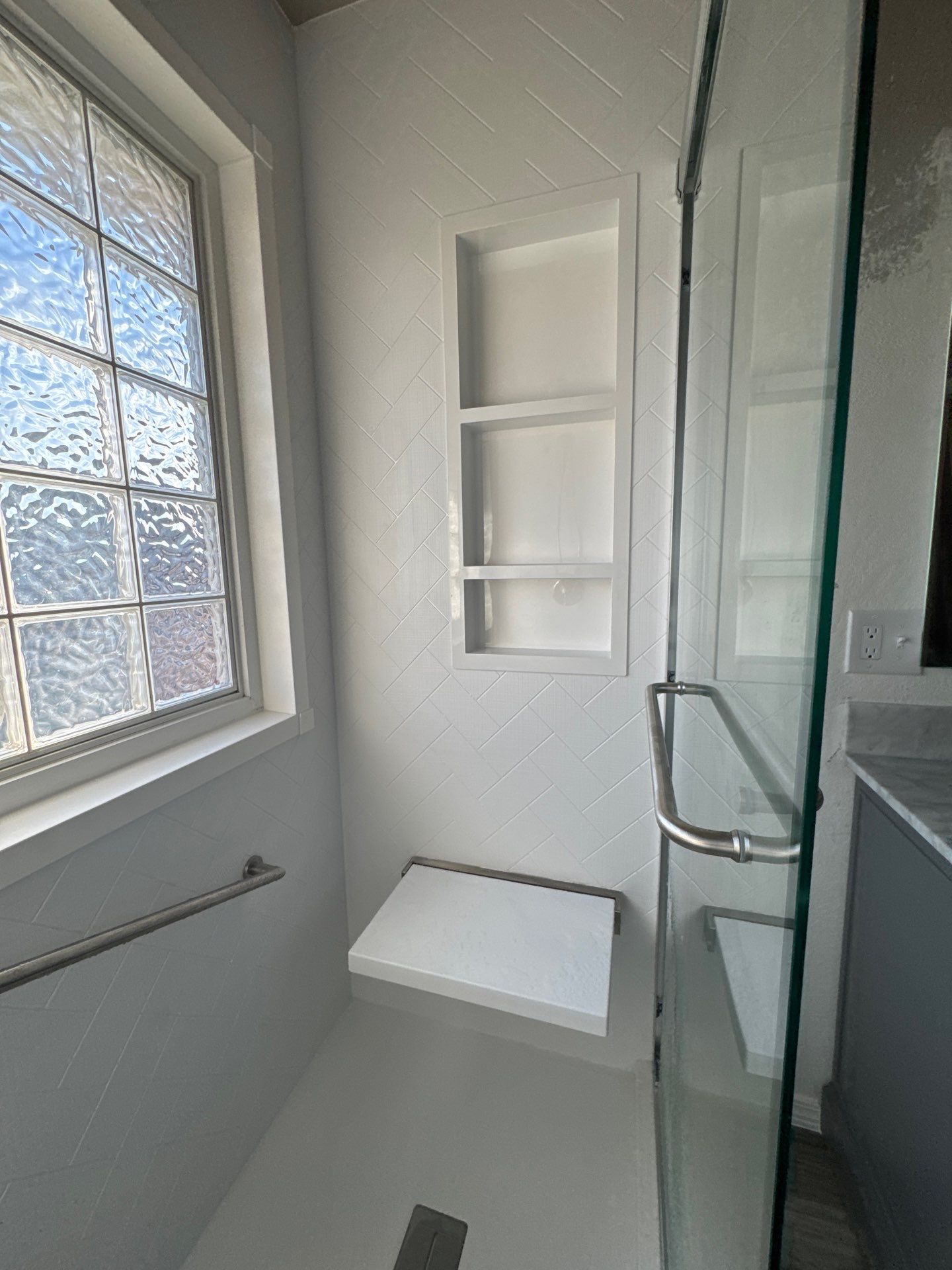 White Simulated Tile, Recessed Caddy, Tub to Shower Conversion, Moen Verso, Folding seat