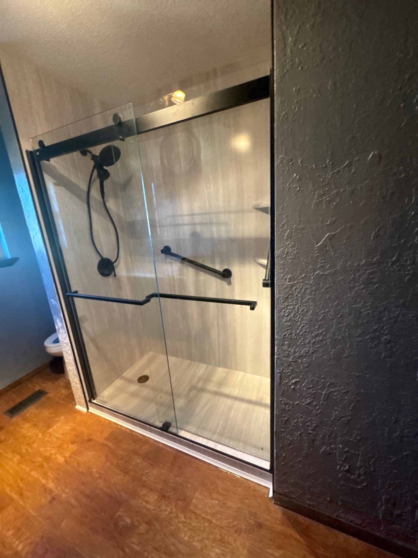 Classic Bypass Slider, Moen Verso, Corner Shelf, Iceberg Gray Walls, Tub to Shower Conversion