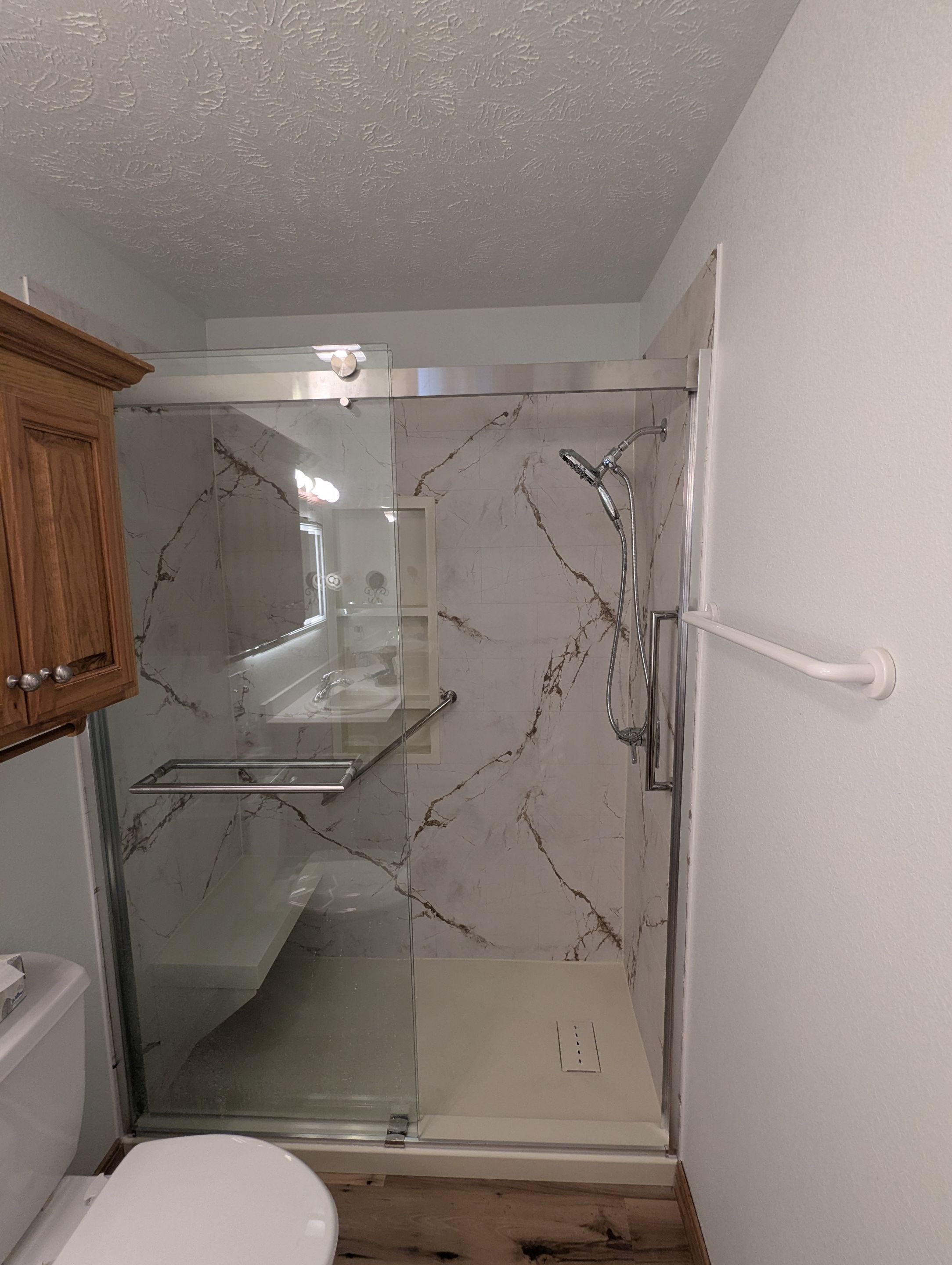 Recessed Caddy, Grab Bar, Moen Verso, Barn Door Slider, Tub to Shower Conversion
