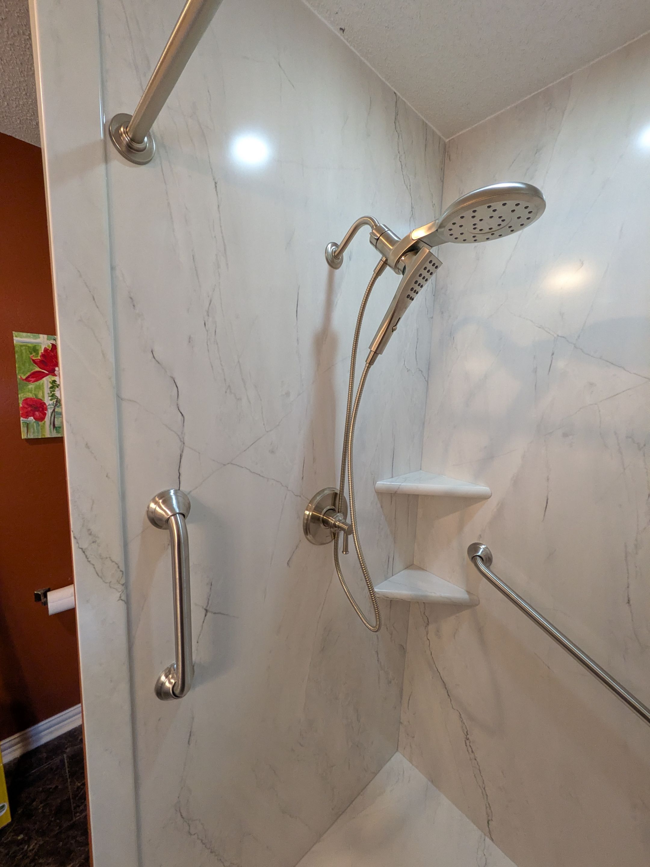 Azzura Bay Walls, Folding seat, Grab Bar, Corner Shelf, Moen Verso, Shower Replacement