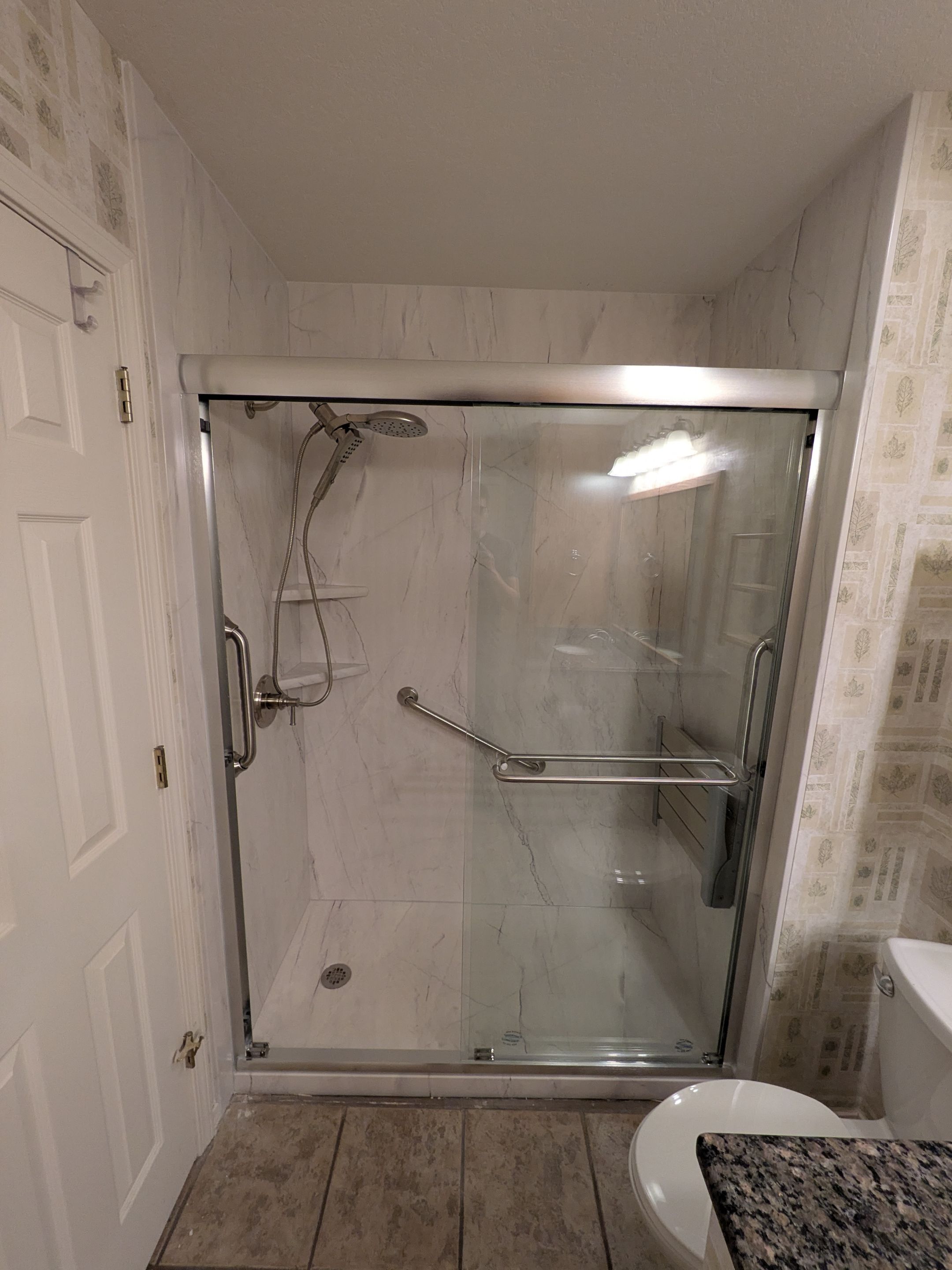 Azzura Bay Walls, Moen Verso, Grab Bar, Folding seat, Classic Bypass Slider, Shower Replacement