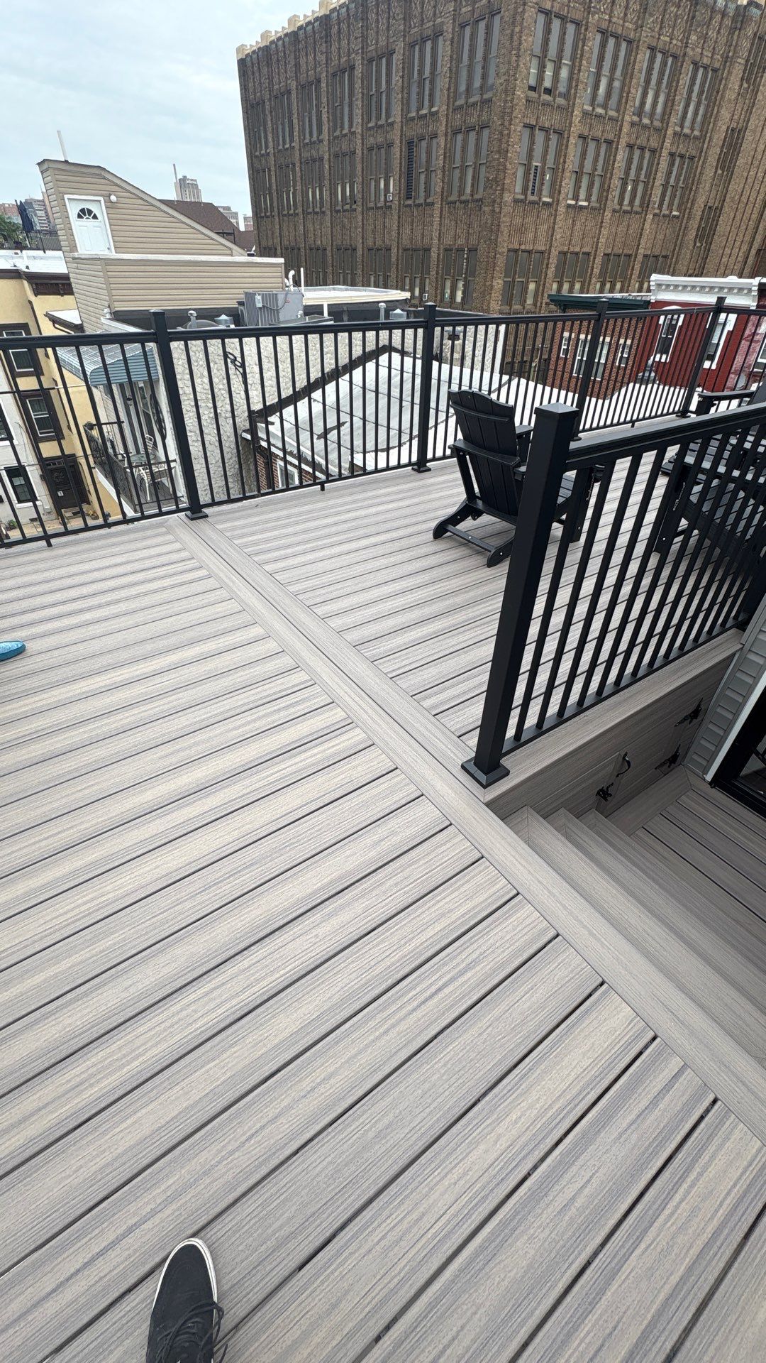 We replaced the old deck and roof with a new TPO roofing system and custom Trex deck with aluminum railing and new vinyl siding on the pilot house.