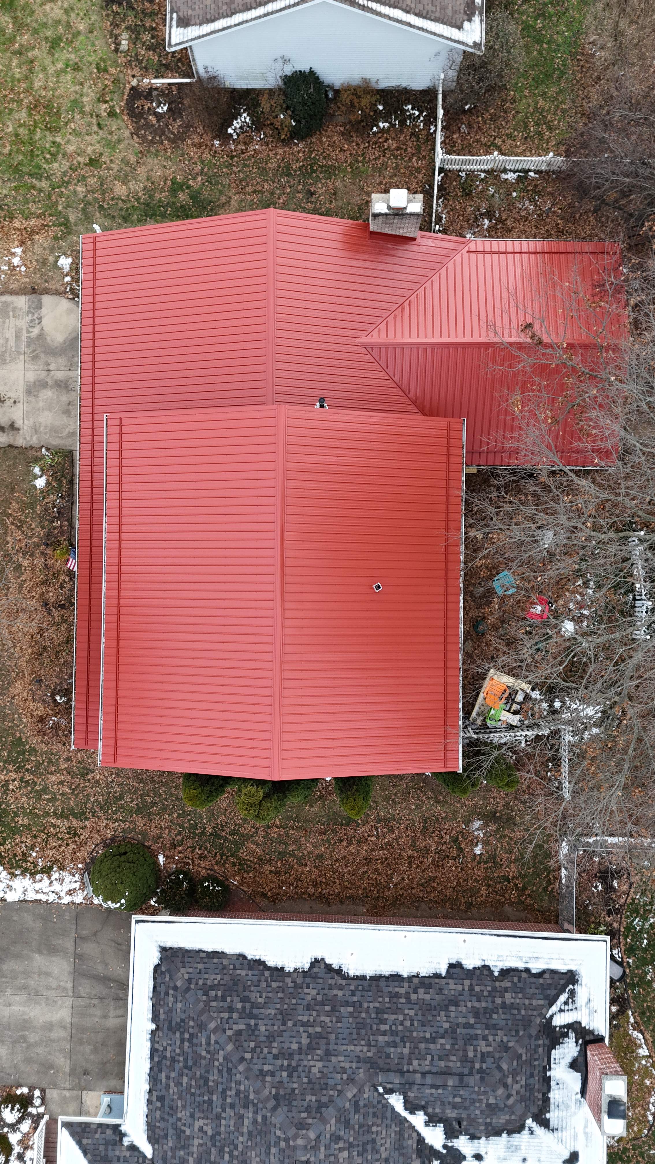 New Philadelphia, Ohio – Roof Replacement We removed the old shingles and installed new Premier Rib Metal in the "Rustic Red" color
