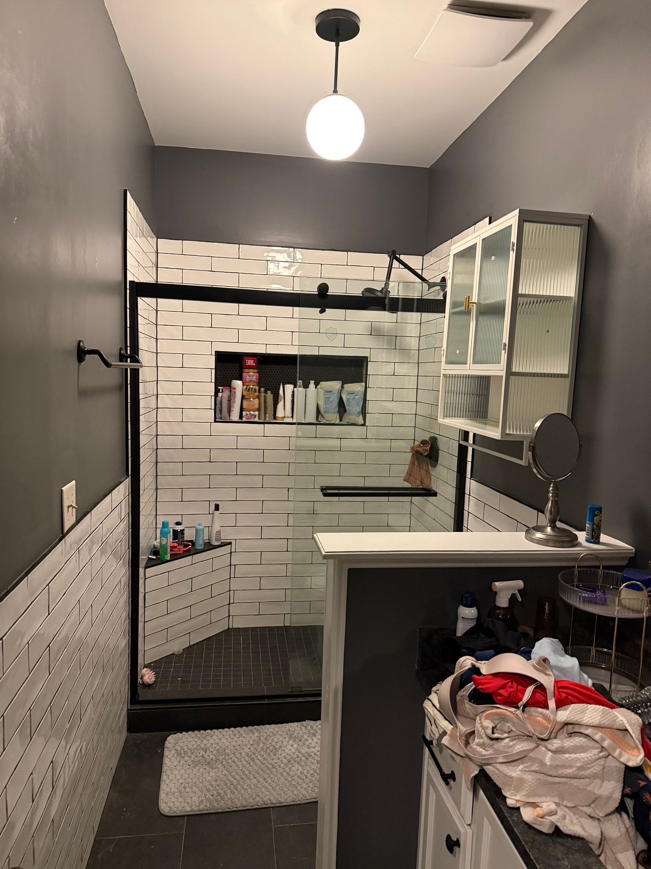 For this hallway bathroom renovation, our team helped transform the layout to create a more open and functional space. The project began with several structural modifications, including removing the door between the vanity area and the toilet area and framing the opening to create a seamless, continuous wall. We also modified the dividing wall between the two spaces, converting it into a half wall and trimming the top for a clean, finished appearance. Additional updates included removing the existing door and frame between the bathroom and the adjacent bedroom and framing the opening on both sides to permanently close off that access point. Throughout the bathroom, we repaired sheetrock where needed, including addressing nail pops on the ceiling and repairing the wall after removing the large mirror above the vanity. The bathroom vanity was refreshed by sanding, priming, and painting the cabinet doors, drawer faces, and cabinet frames in white, giving the space a bright, updated look. We also replaced the cabinet hardware and installed new mirrors and updated light fixtures provided by the homeowner. To improve ventilation, a larger bathroom fan was installed above the toilet area. Once all repairs and modifications were complete, we painted the walls, ceiling, and trim throughout the entire bathroom to give the space a clean, cohesive finish. After the main renovation was completed, we returned at a later time to complete the finishing touches. This included assembling and installing a new cabinet, installing a glass shower door, and mounting bathroom accessories including a towel holder, toilet paper holder, and hand towel holder. Tile and plumbing work for the project was completed by our trusted partner, JACO Contracting. This project is a great example of how thoughtful layout changes, fresh paint, and updated fixtures can completely refresh a bathroom while improving both functionality and appearance.