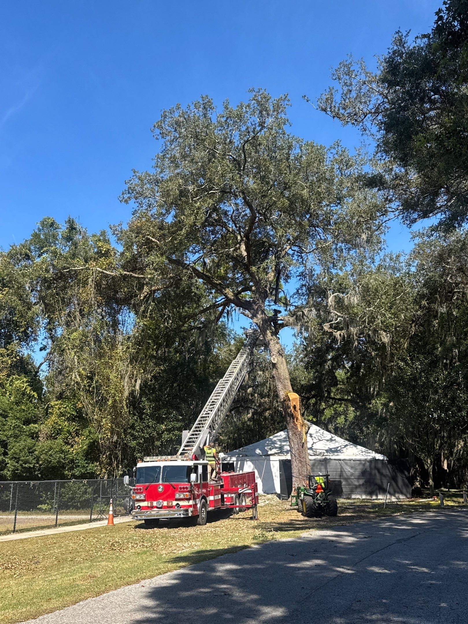 This dead and dangerous tree was overhanging a tent that is being used as a temporary gym. The tree is time consuming because we had to rope off nearly every cut. The day we started took us 10 hours and there was a day two, as well. Whew.