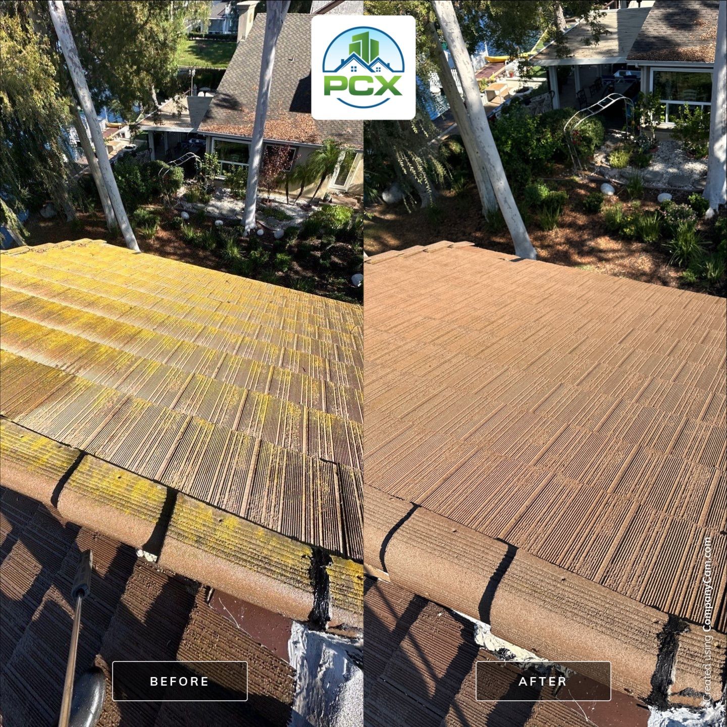 From top to bottom, this house got the the whole shebang. We started with pressure washing the roof with a surface cleaner and turbo nozzle for those tight crannies. Once the roof was clear of organic debris, we flushed the gutters out and cleared them of all leaves, mud, and moss. There were two upstairs patios that were in desperate need of attention. With a treatment from our soft wash mix, we were able to get these patios looking like it just got a brand new painted floor job. After all of that, we washed the whole house of overspray, organic growth, and years of cobwebs and dust. Yuck! The results speak for themselves and this homeowner couldn’t be happier knowing he will get top dollar for his investment.