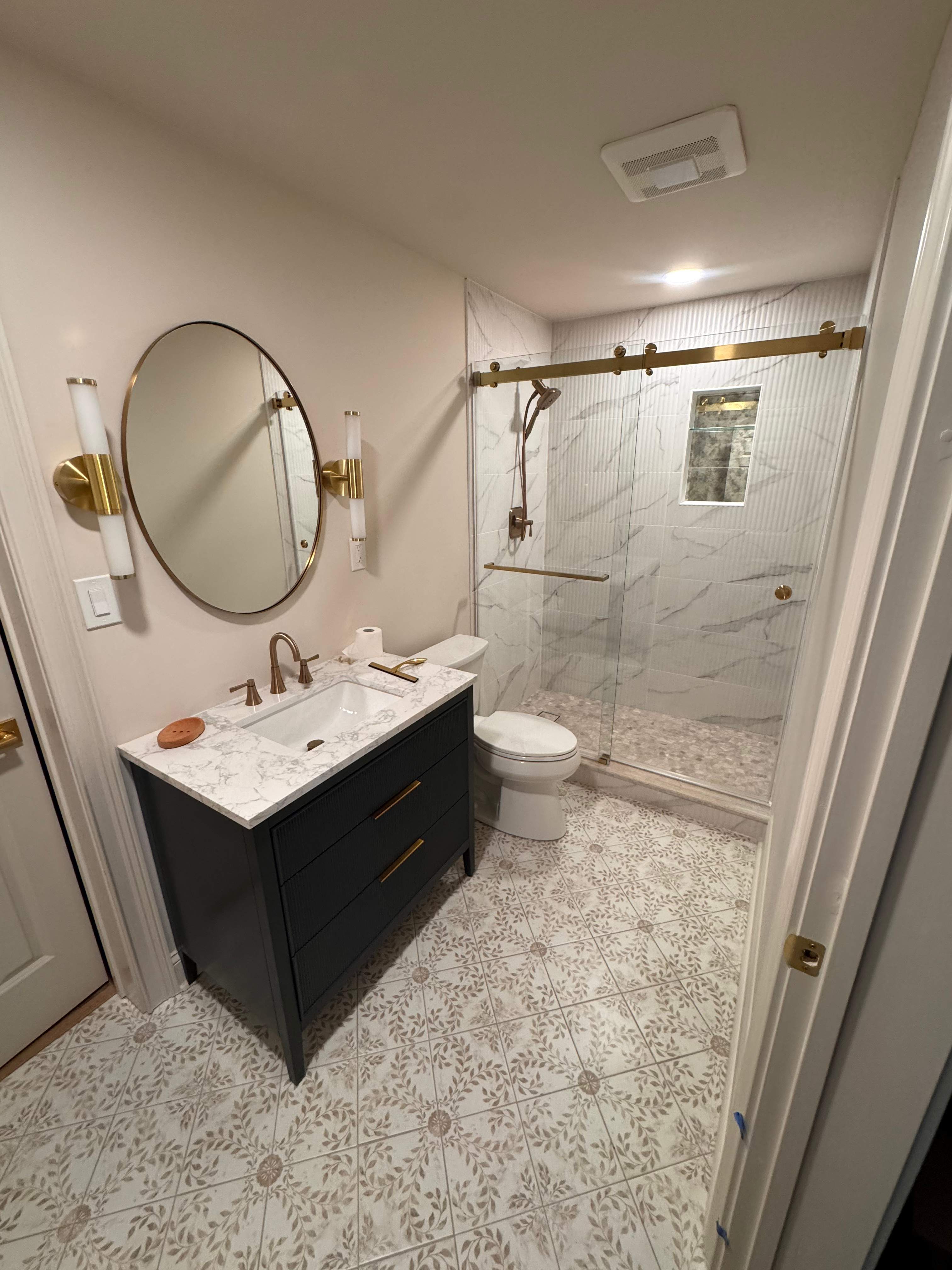 You won't believe it, but before, this basement was just the wood studs and the pipes in the concrete. Nothing else! We built this completely from scratch. Look at this gorgeous contrast! We put this super beautiful dark vanity—it has these nice textures on the front—and a top that looks like marble. The gold details are my favorite. We installed a round mirror and these very nice wall lights to make the space warm and inviting. And the shower? Oh my God, it's like a spa. We used heavy glass doors sliding on this very cool gold track. Inside, we combined big marble-style tiles with these beautiful ribbed tiles on the back wall. Super elegant! We also made a custom niche for the shampoo and put those relaxing little stones on the shower floor. To finish everything, we chose this floor tile with a cute floral design. It brings so much charm to the room and balances the modern look. From an empty basement to this luxury bathroom... we are so proud of this work!