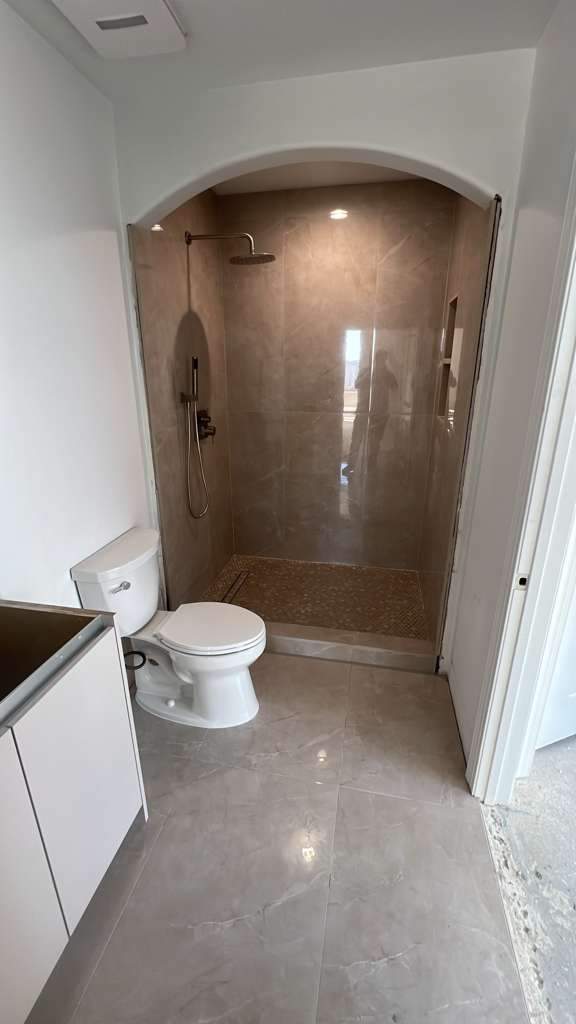 This project was quite straightforward. The bathroom was already demolished and all set for construction. We added a new shower valve and drain, moved the niche to the right spot, and put in large beige-looking tiles on the shower walls and floor, along with a lovely Delta shower system. The outcome is really impressive. Later, we did some wall patching and painting on the shower’s edges to give it a nice, finished look.