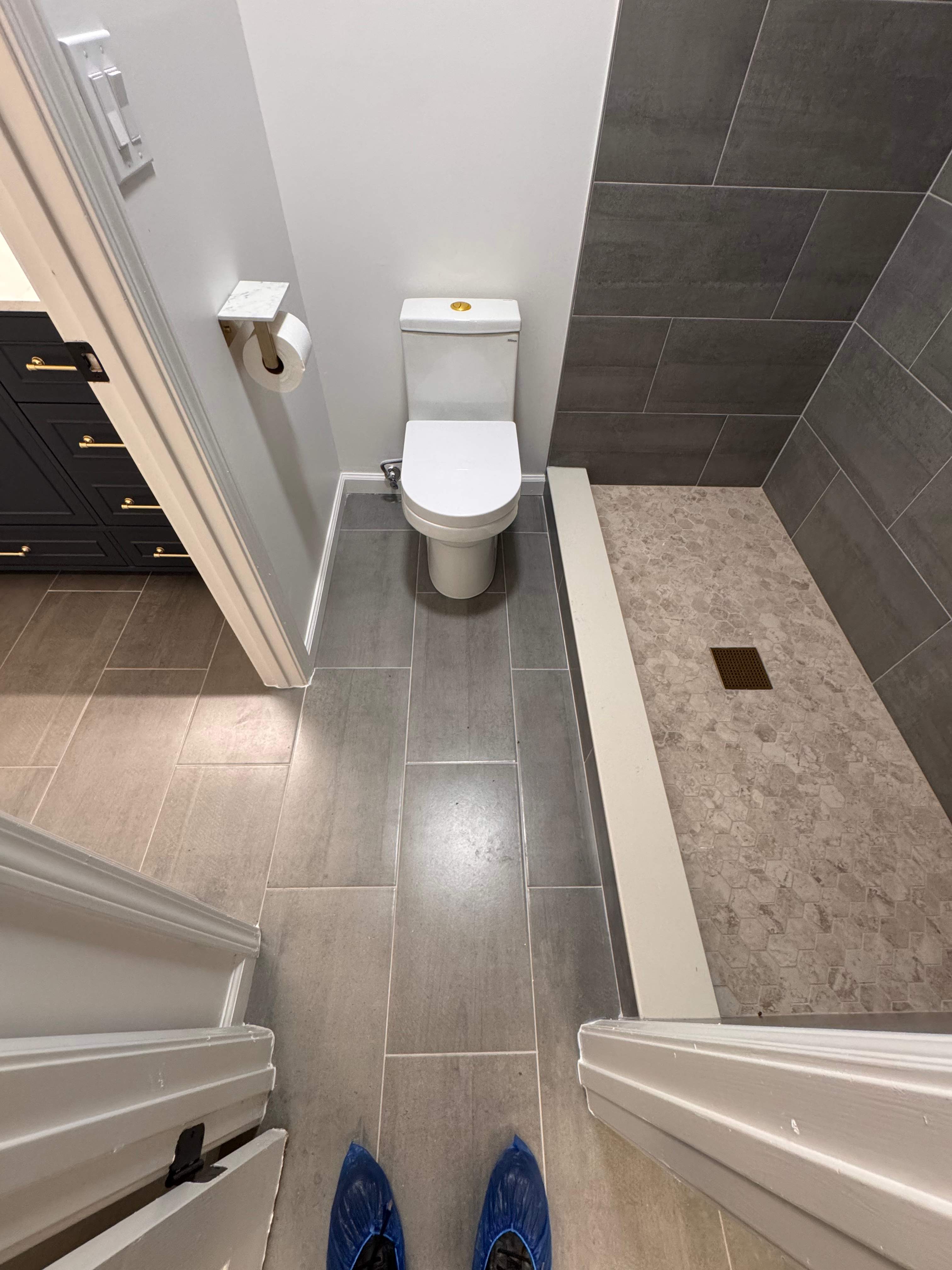 This bathroom underwent a complete makeover, resulting in a stunning transformation. The tub was converted into a walk-in shower, creating a harmonious blend of dark gray tiles on the shower walls and bathroom floor, and a beige textured hexagonal shower floor. The shower features a rain shower system, a hand shower, and a two-level niche. The trims are finished in brushed gold, and a 6-inch square drain with a convenient basket for cleaning is included. The homeowner also opted to replace both vanities with modern 60-inch vanities, complemented by new vanity lights. The walls and ceiling were patched and painted, further enhancing the overall aesthetic of the bathroom.