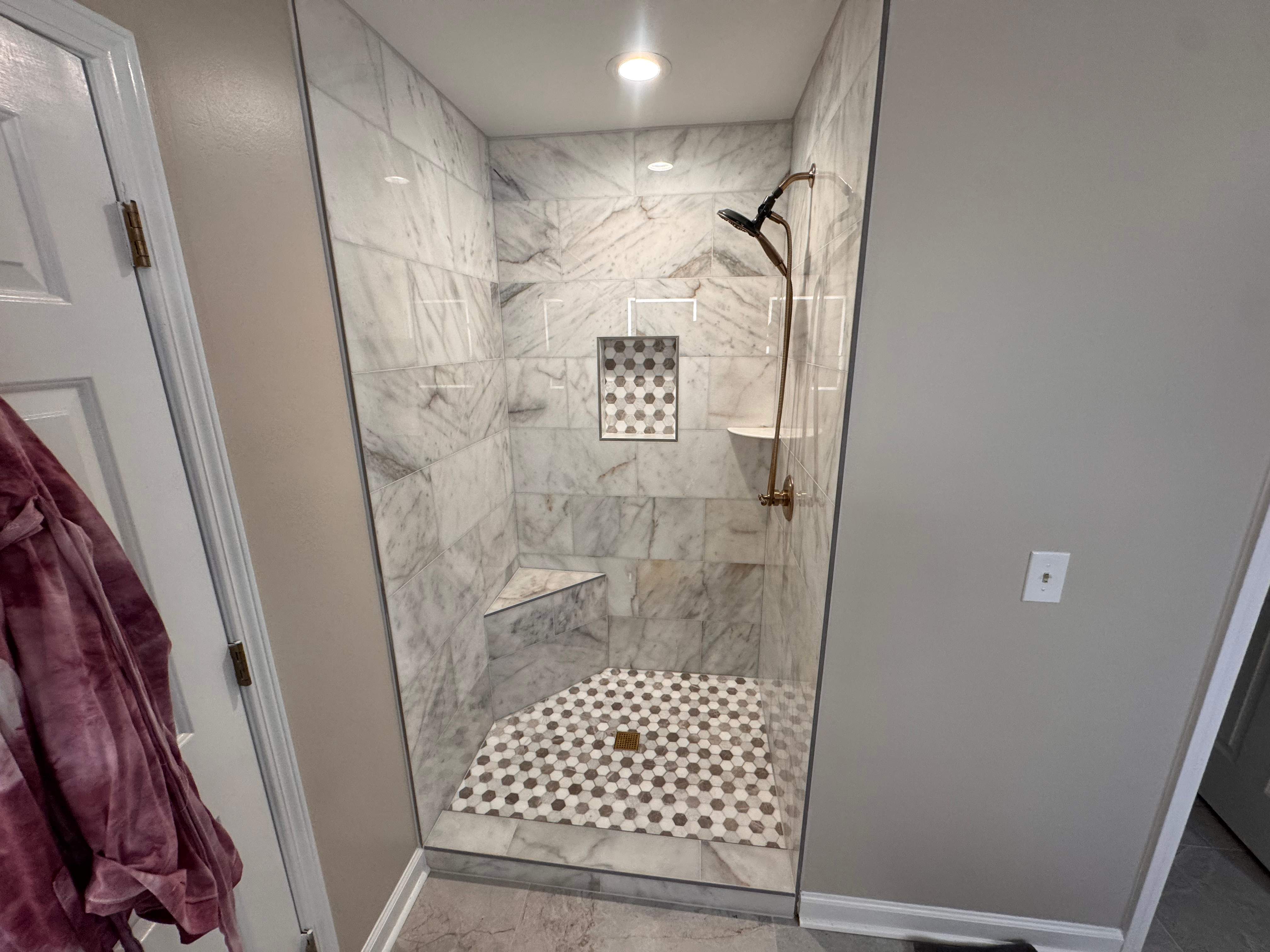 This project evolved as it progressed. Initially, the homeowner had only intended to renovate the shower. However, the project expanded to include a full bathroom makeover, encompassing the installation of a bathroom floor, a freestanding tub, and a double vanity. The outcome was truly remarkable. The shower is now fully real marble, creating an elegant and spacious area with a corner bench and a niche. We also installed porcelain tiles on the floor. The freestanding tub, the filler, and the new double vanity added a modern touch and enhanced the convenience of the bathroom. The overall result is truly impressive.