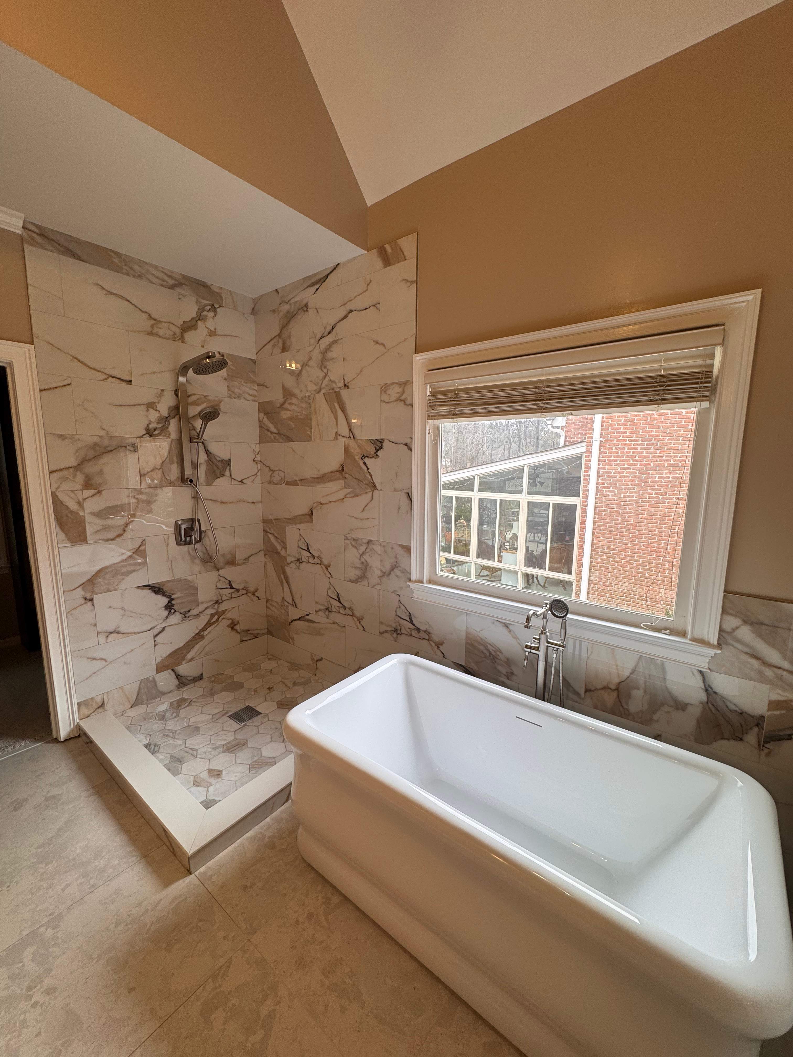 This project involved an intriguing swap of spaces. A shower area was transformed into a double vanity, while a single vanity was converted into a brand new shower. The entire bathroom was designed with a stunning tile composition. The walls were adorned with creamy white tiles featuring bold veins in gray tones and subtle gold accents that resembled stone. The bathroom flooring was covered with a beautiful unpolished tile, and a medium hexagonal mosaic adorned the shower floor. The overall design achieved a harmonious blend of textures and colors. The homeowner also requested a freestanding tub, painting, mirrors, lighting fixtures, and even the flooring of their master bedroom, which was finished with hardwood. This impressive renovation resulted in a more functional and modern master bathroom.