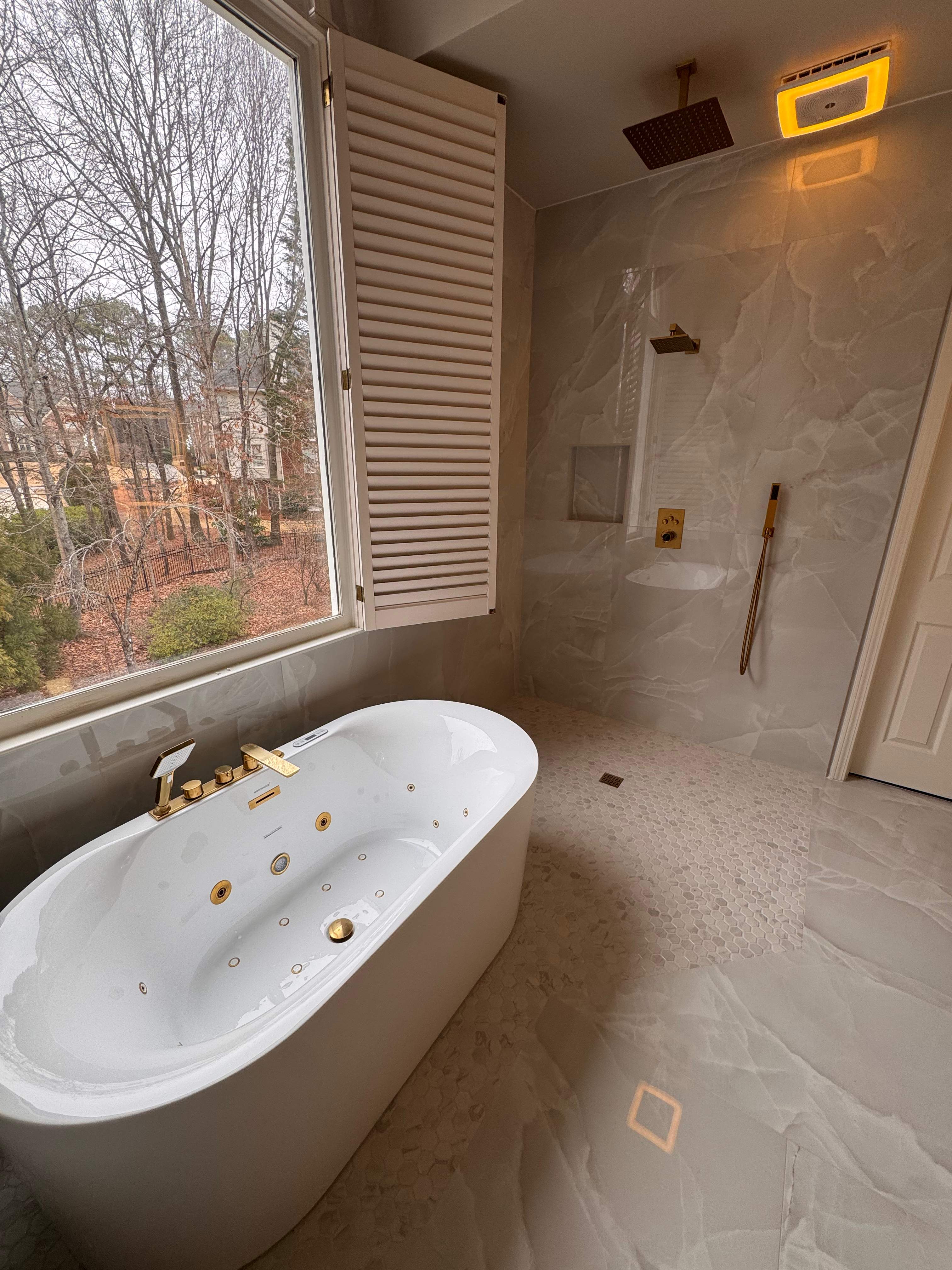 This renovation project showcases the transformative power of a bathroom makeover. What was once a cramped, dimly lit, and outdated shower with a standard tub has been transformed into a stunning, open wet room. The space is free of curbs and walls, creating a seamless and modern look with clear tiles and impeccable finishing. The homeowner opted for a freestanding tub with jets, air bubbles, water heater, and chromotherapy, ensuring warm water and a relaxing experience. They also requested updates to their two vanities, including new tops and painting. The bathroom now features a smart toilet, LED mirrors, a barn door, an exhaust fan with lights and speakers, and fresh paint. This is a massive project, and we congratulate the homeowners on their commitment to improving their living space.