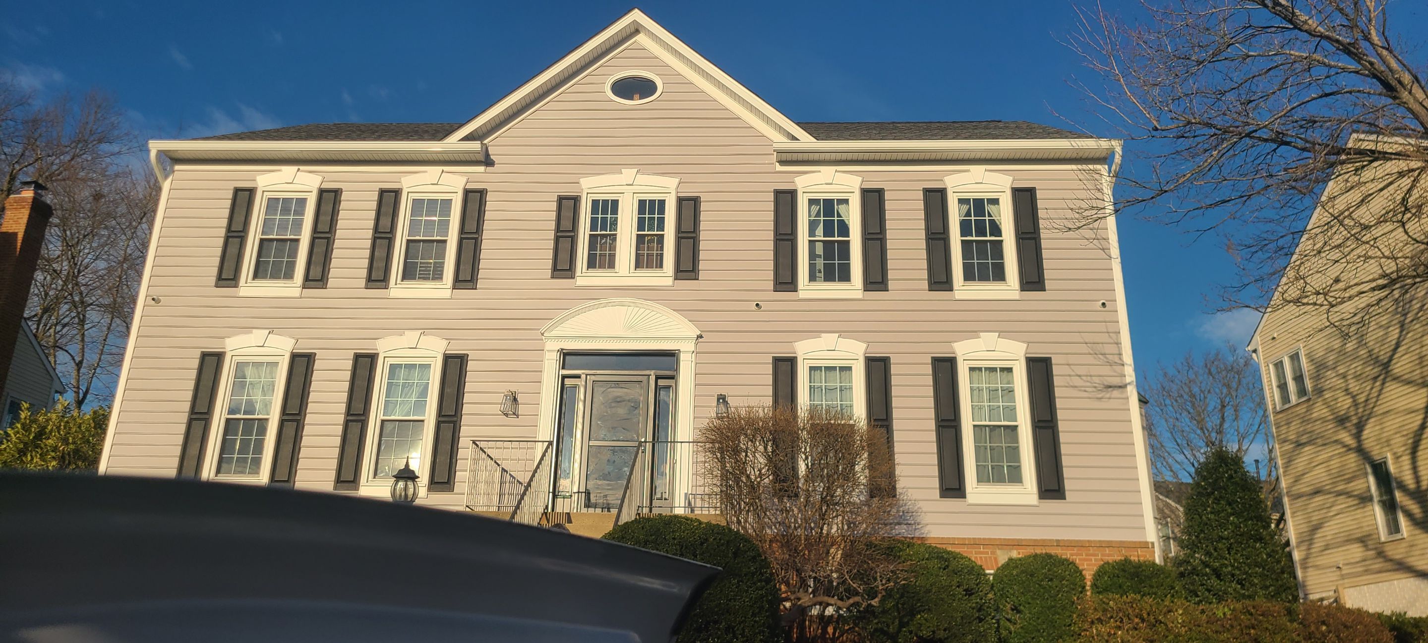 Mastic Charleston Beaded Vinyl Siding in Victorian Gray with White trim Mastic Vented Vinyl Soffit in White ProVia Heritage Fiberglass Entry Door with Sidelites and Transom in Coal Black Mastic Raised Panel Vinyl Shutters in Black Custom 6" Aluminum Gutters & Downspouts in White