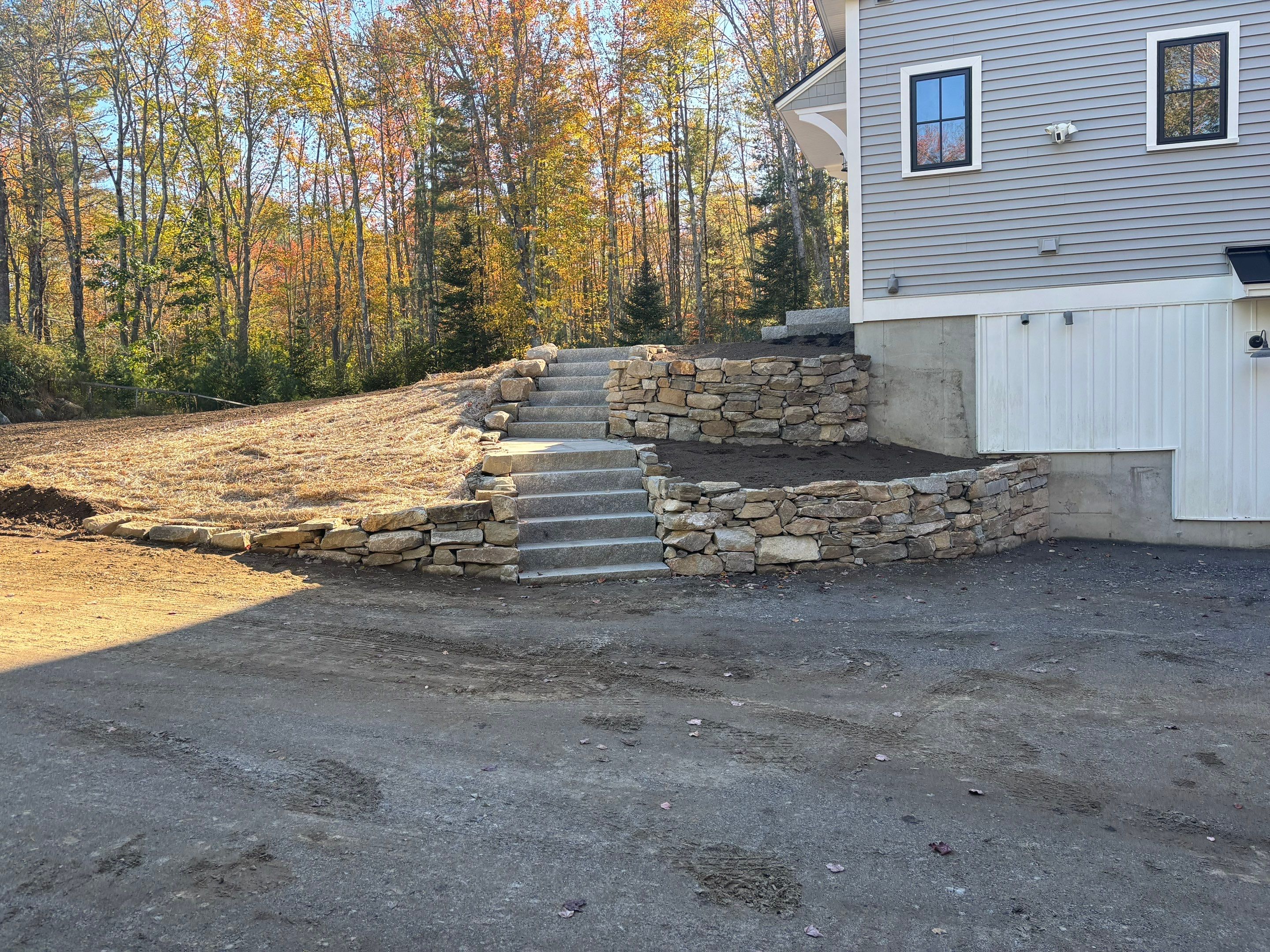This customer had a three tiered concrete block retaining wall. These were removed and replaced with natural stone retaining walls using Black Mountain Wall Stone mixed with Gray Nubble Wall Stone. The paver walkway was removed, the stairs were reconfigured and five more steps were added. The walkway was redone using black mountain flagging. On the side of the house a retaining wall an paver patio were installed to provide additional outside space for gathering. A circular fire pit was installed in the back yard and ringed with decorative round stone. In addition a catch basin was added to provide drainage and erosion management for water shed from the roof and piped into the woods. The front and back lawns were stripped of existing grass, fresh loam was brough in and both lawns were graded to prepare for microclover seeding. The driveway was expanded, graded and prepared for paving.