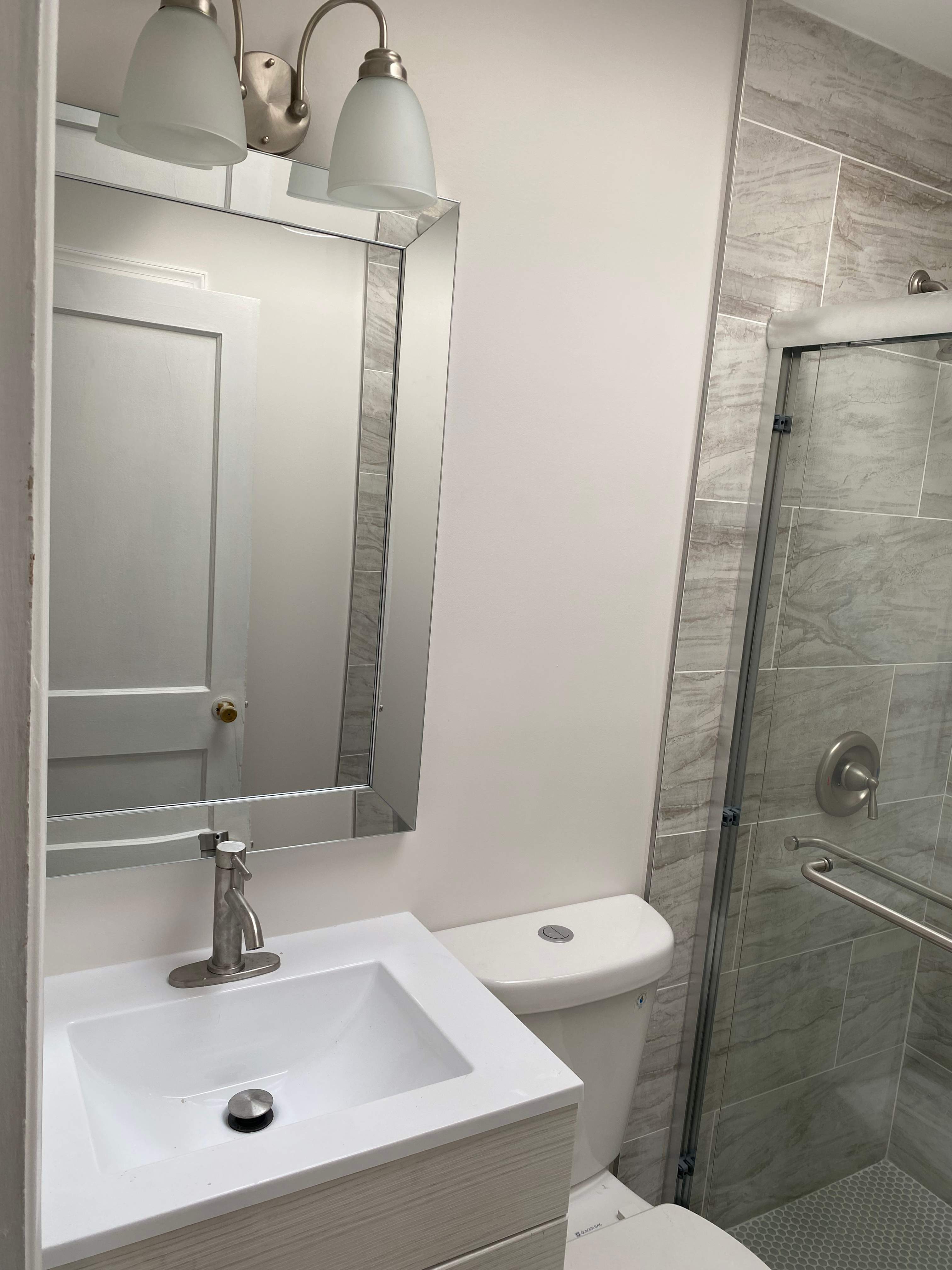 Clean & Modern Gray Tile Bathroom Renovation. This bathroom renovation features a timeless, spa-inspired design centered around soft gray stone-look tile. The tub and shower surround showcases large-format tile with subtle veining, paired with a slip-resistant mosaic floor for added safety and durability. A sleek white vanity with integrated sink keeps the space feeling bright and uncluttered, while brushed nickel fixtures and modern lighting add a polished finish. The sliding glass tub enclosure maximizes light and openness, creating a fresh, functional bathroom designed for everyday comfort and long-term style.