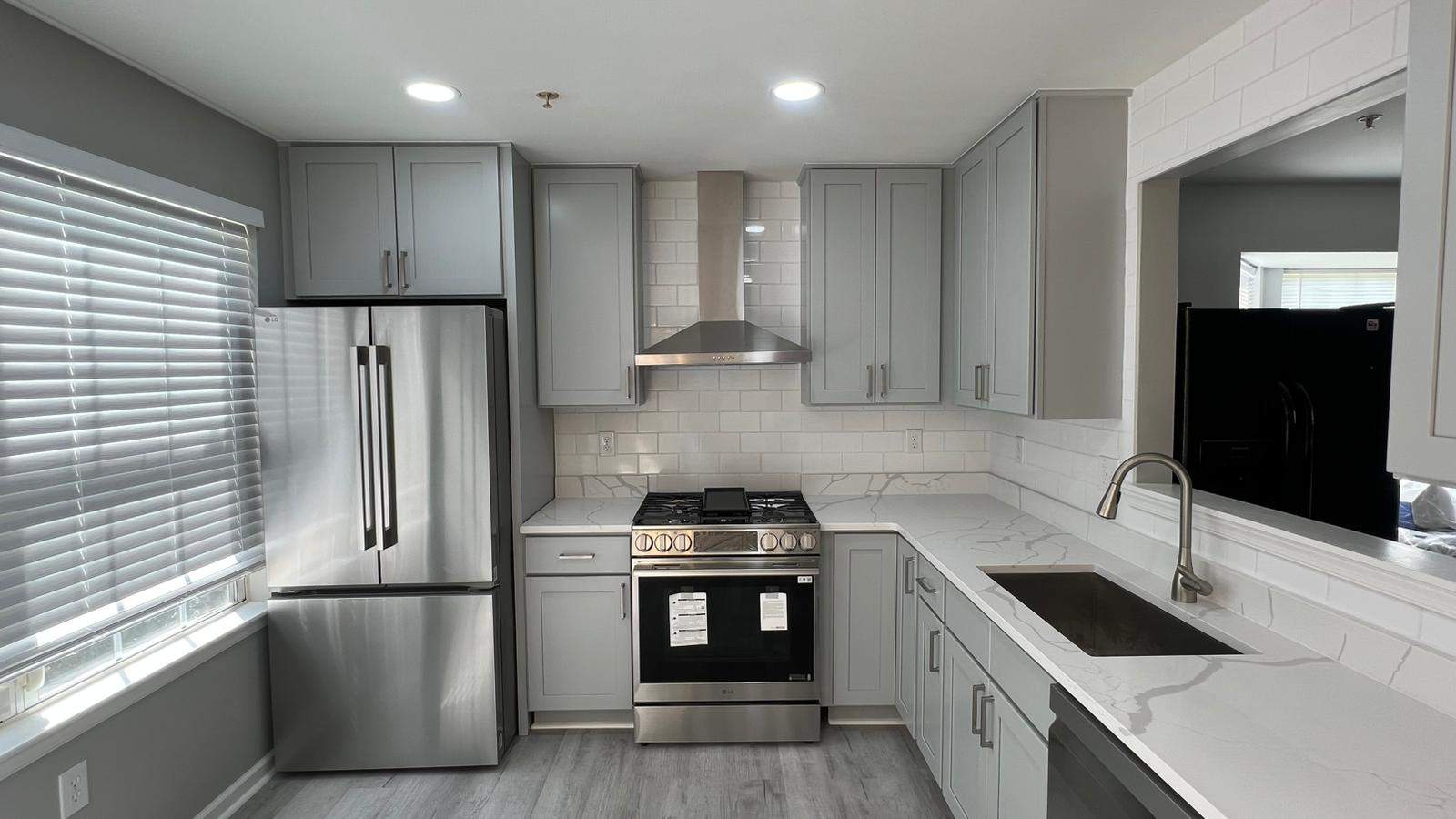 Bright & Modern Open-Concept Kitchen Renovation. This kitchen renovation transforms the space into a bright, modern hub designed for both everyday living and entertaining. Soft gray shaker-style cabinetry provides a clean, timeless foundation, while crisp white quartz countertops with subtle veining add elegance and durability. A classic white subway tile backsplash enhances the light, airy feel and ties the design together. Stainless steel appliances—including a gas range with a sleek vent hood—bring both performance and contemporary appeal. Updated lighting, including recessed fixtures and a modern chandelier, ensures the space is well-lit and welcoming throughout the day. Wide-plank flooring grounds the room with warmth and continuity, while the open pass-through and layout improve flow and functionality. The result is a cohesive, stylish kitchen that balances modern finishes with practical design, creating a space that feels fresh, inviting, and built to last.