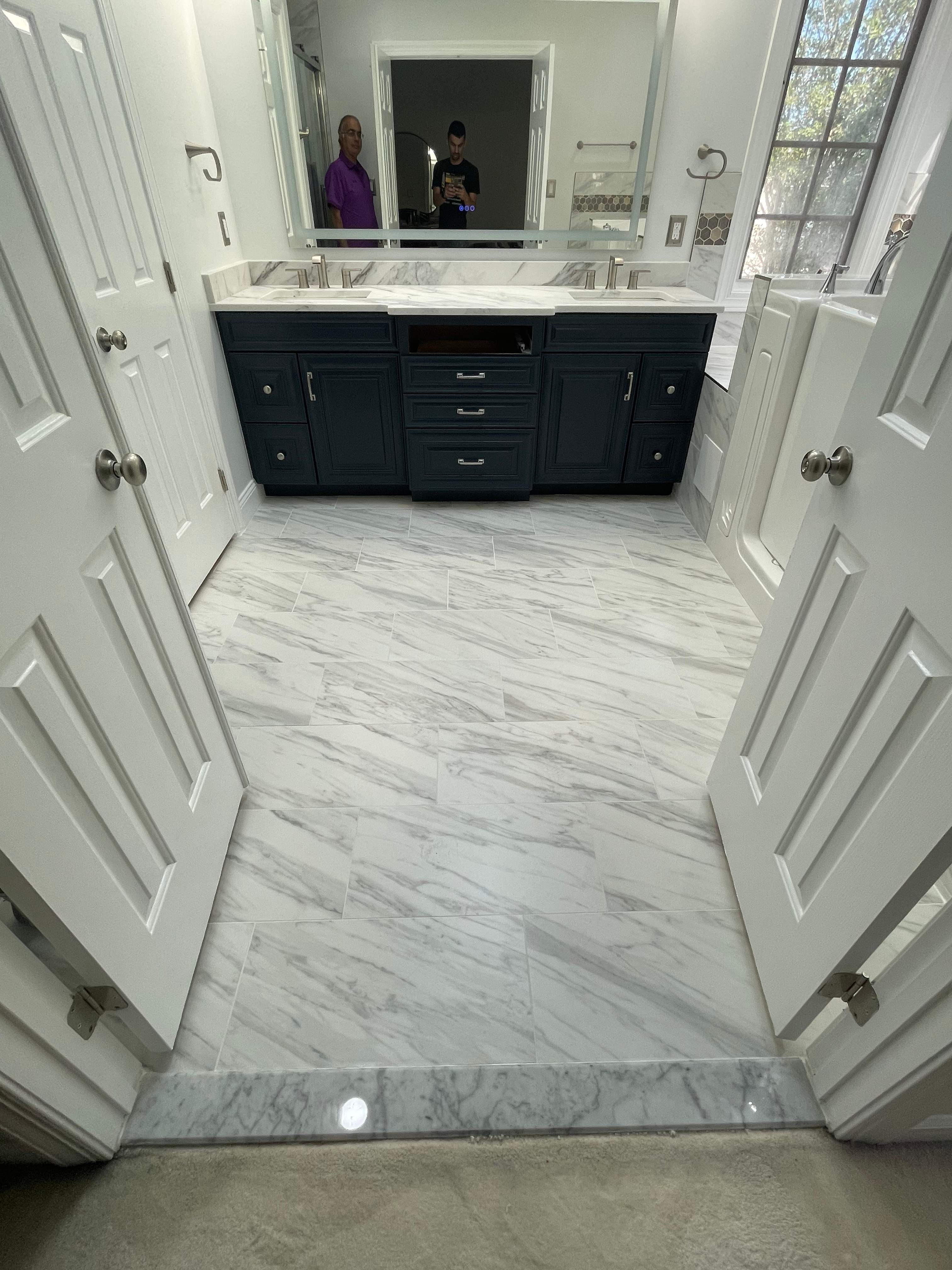 Timeless Spa-Inspired Bathroom Remodel with ADA Walk-In Tub & Custom Shower. This bathroom renovation creates a clean, spa-inspired retreat designed with comfort, safety, and everyday luxury in mind. The space features an ADA-compliant walk-in tub, providing enhanced accessibility while maintaining a sleek, modern appearance. Complementing the tub is a beautifully tiled walk-in shower with a custom glass enclosure, built-in niche, and refined hardware for a bright, open feel. A double-sink vanity offers ample storage and functionality, paired with elegant countertops, upgraded fixtures, and large mirrors that enhance both style and usability. Soft neutral tones, marble-inspired tile, and durable flooring tie the space together, while thoughtful lighting completes the transformation. The result is a timeless, accessible, and inviting bathroom designed to support comfort and independence without sacrificing design.