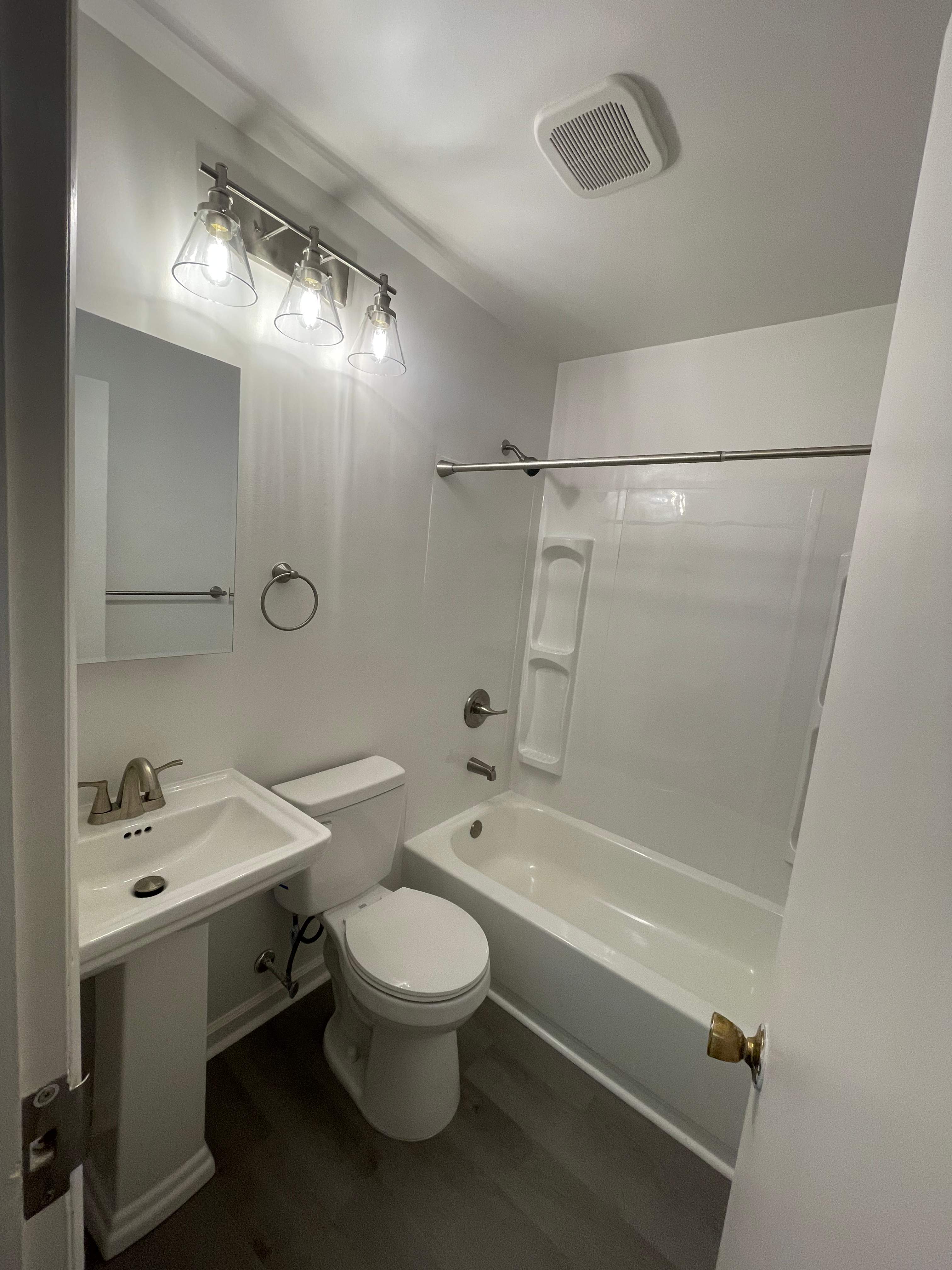 Bright & Functional Hall Bathroom Renovation. This hall bathroom renovation delivers a clean, refreshed look with an emphasis on simplicity, durability, and everyday functionality. The tub and shower area was upgraded with a crisp, low-maintenance surround that creates a bright, seamless finish while maximizing water protection and ease of cleaning. Brushed nickel fixtures provide a timeless, neutral accent that complements the space. The vanity area features a classic pedestal sink paired with updated lighting and a modern mirror, improving both usability and visual balance in the room. Fresh finishes, neutral tones, and improved lighting work together to make the bathroom feel more open and inviting. Designed for reliability and long-term performance, this remodel offers a practical yet polished solution—ideal for a high-traffic bathroom and a strong addition to a CompanyCam Showcase.