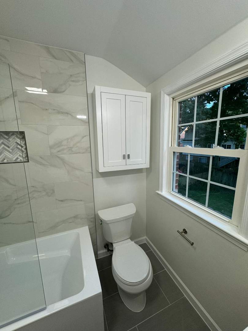 Light & Airy Bathroom Remodel with Modern Storage Solutions. This bathroom renovation creates a bright, open feel through clean lines and thoughtfully selected finishes. Marble-style tile in the tub and shower area adds timeless elegance, while a frameless glass panel enhances natural light and visual flow. A warm wood vanity with a white countertop introduces contrast and character, paired with modern fixtures and lighting for a polished look. Custom wall-mounted cabinetry maximizes storage without sacrificing space, resulting in a functional, inviting bathroom designed for everyday comfort and long-lasting style.