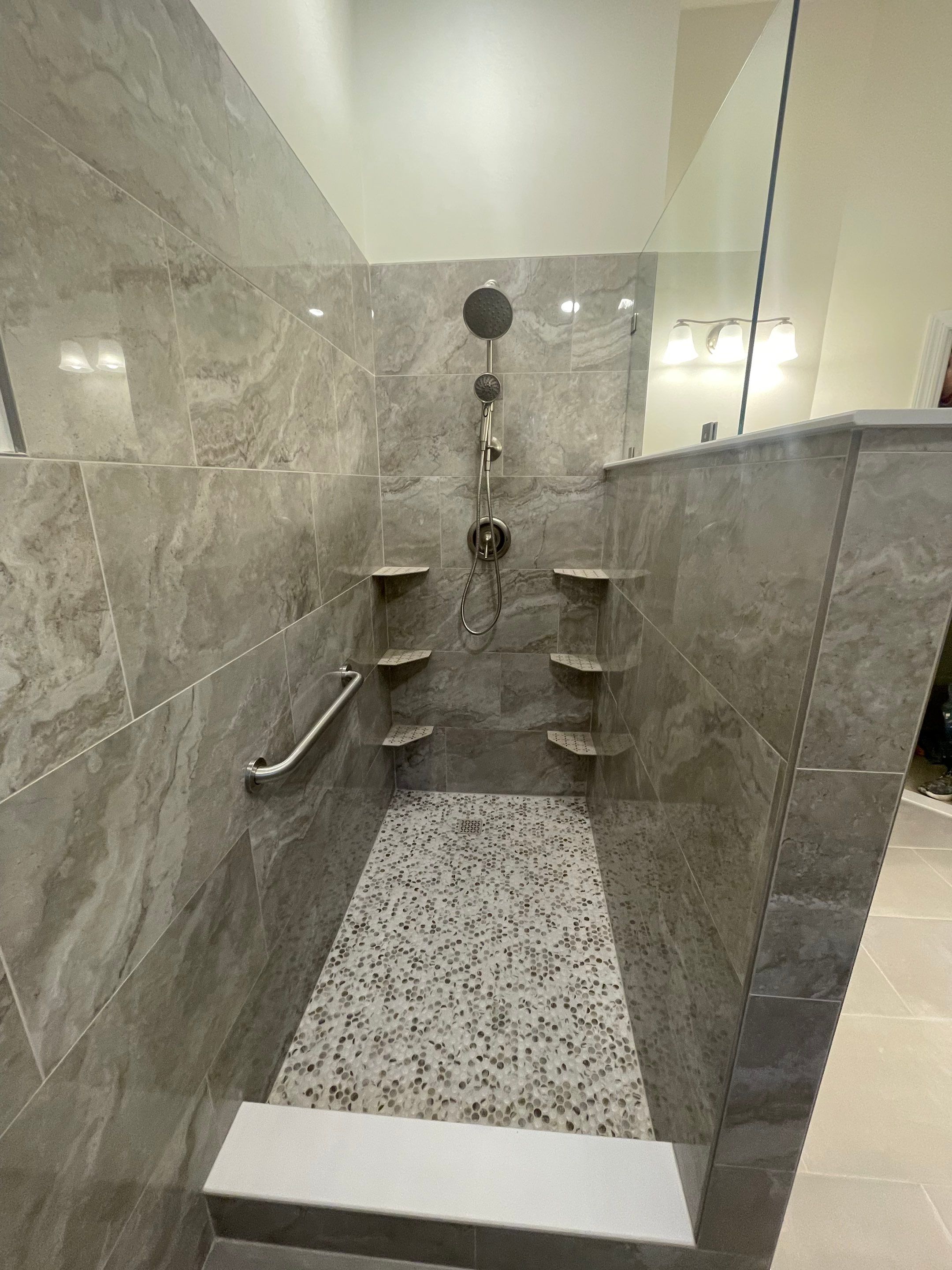 Bright & Functional Bathroom Remodel with Walk-In Shower. This bathroom remodel delivers a clean, modern update focused on both style and functionality. Soft neutral wall tones and large-format tile create a bright, open feel throughout the space. The custom walk-in shower features full-height stone-look tile, built-in corner shelves for storage, a pebble-style shower floor, and a sleek glass enclosure that enhances the room’s openness. A spacious double vanity anchors the bathroom, offering ample storage and a crisp countertop that complements the tilework. Updated lighting, fixtures, and thoughtful layout improvements complete the transformation, resulting in a bathroom that feels refreshed, practical, and timeless.