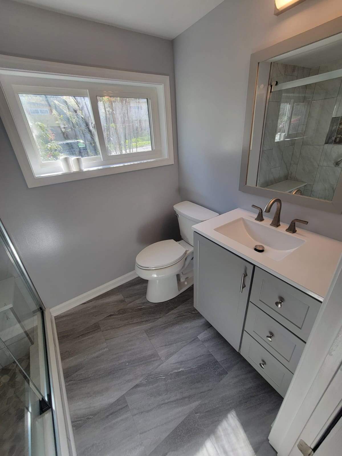 Modern Spa-Inspired Bathroom Remodel with Walk-In Shower. This bathroom remodel transforms the space into a clean, modern retreat with a strong focus on comfort and functionality. The walk-in shower features large-format, marble-look tile, a pebble-style shower floor, built-in bench, and a recessed niche for convenient storage. Frameless glass doors keep the space open and bright while showcasing the sleek tile work. The updated vanity offers ample storage with a soft gray finish, topped with a crisp white countertop and modern fixtures that complement the shower hardware. Durable, wood-look flooring adds warmth and contrast, tying the entire design together. This renovation delivers a timeless, spa-inspired bathroom designed for everyday ease and long-lasting style.